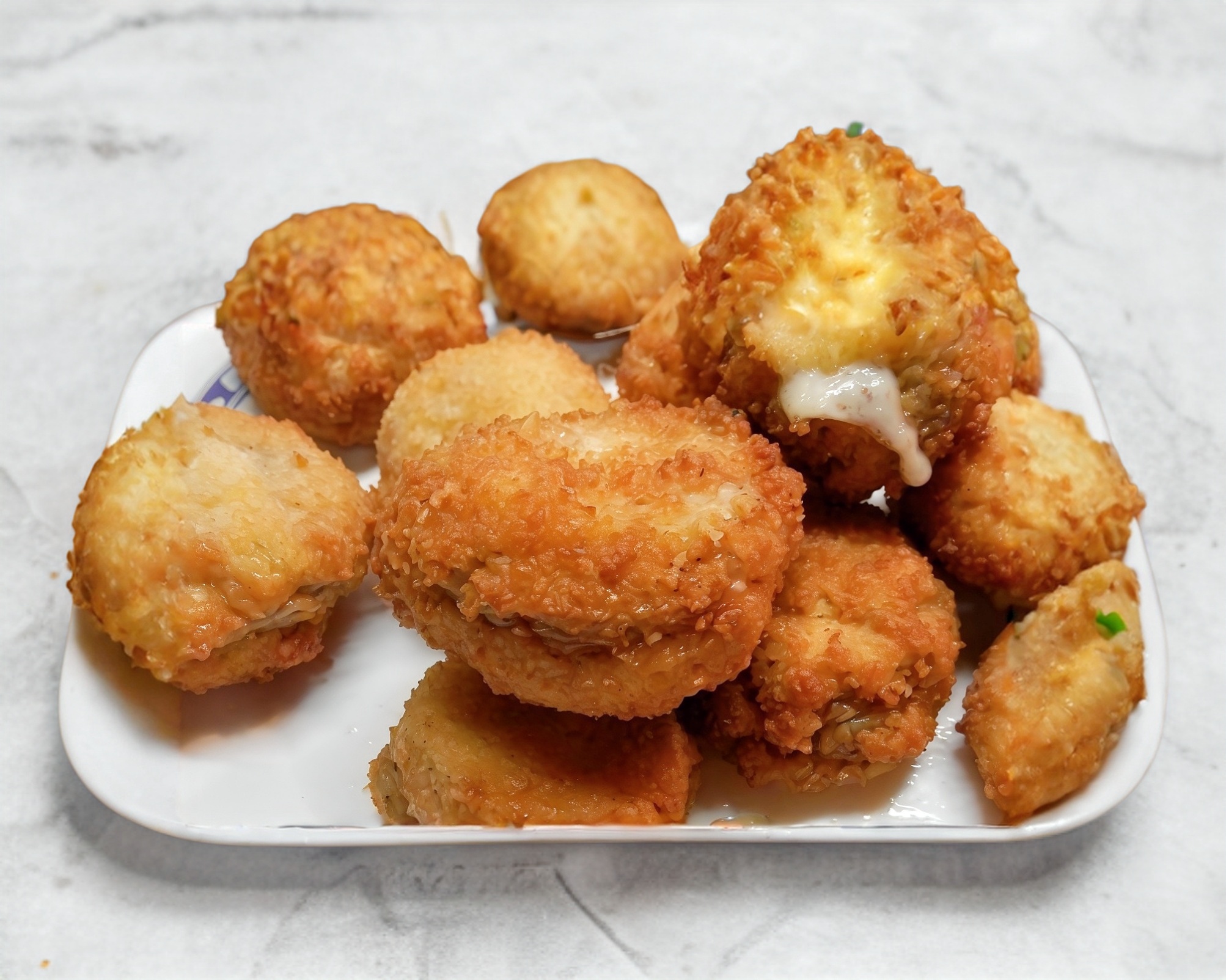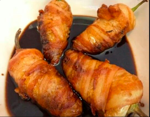 Queso crema, camarón capeado, forrado de queso Monterrey y tocino frito.