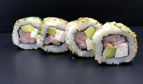 Queso crema, surimi y camarón capeado, forrado de aguacate.
