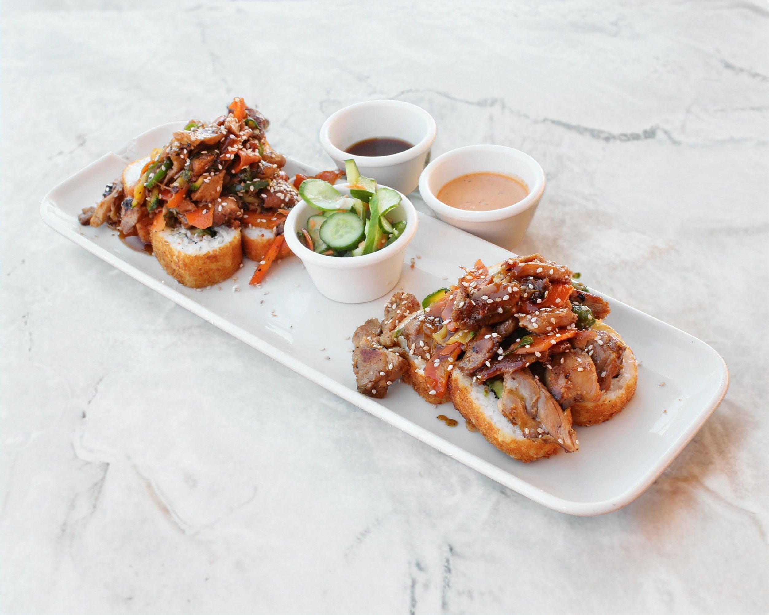 Queso crema, aguacate, marlín ahumado, forrado de chile güerito y queso Monterrey.