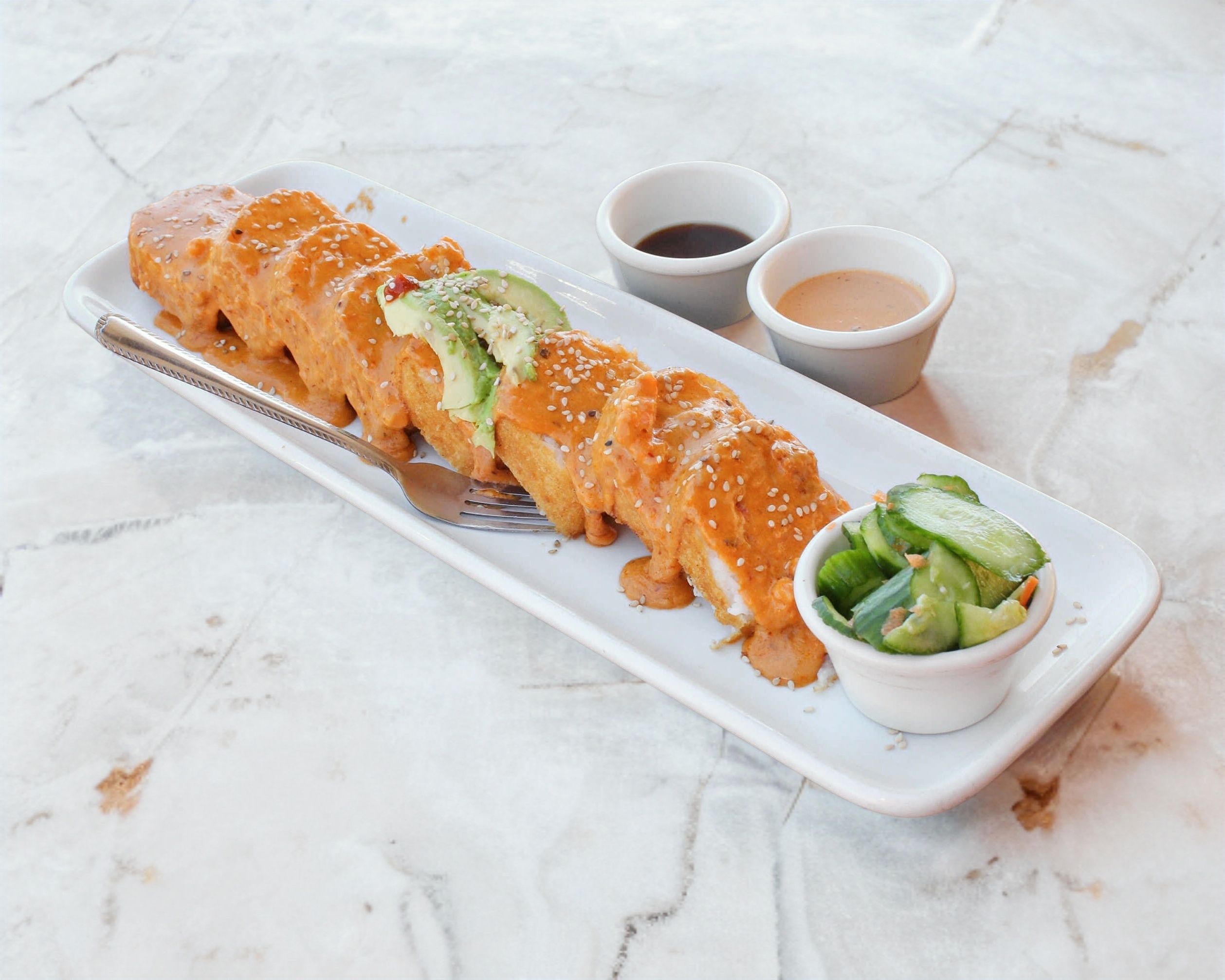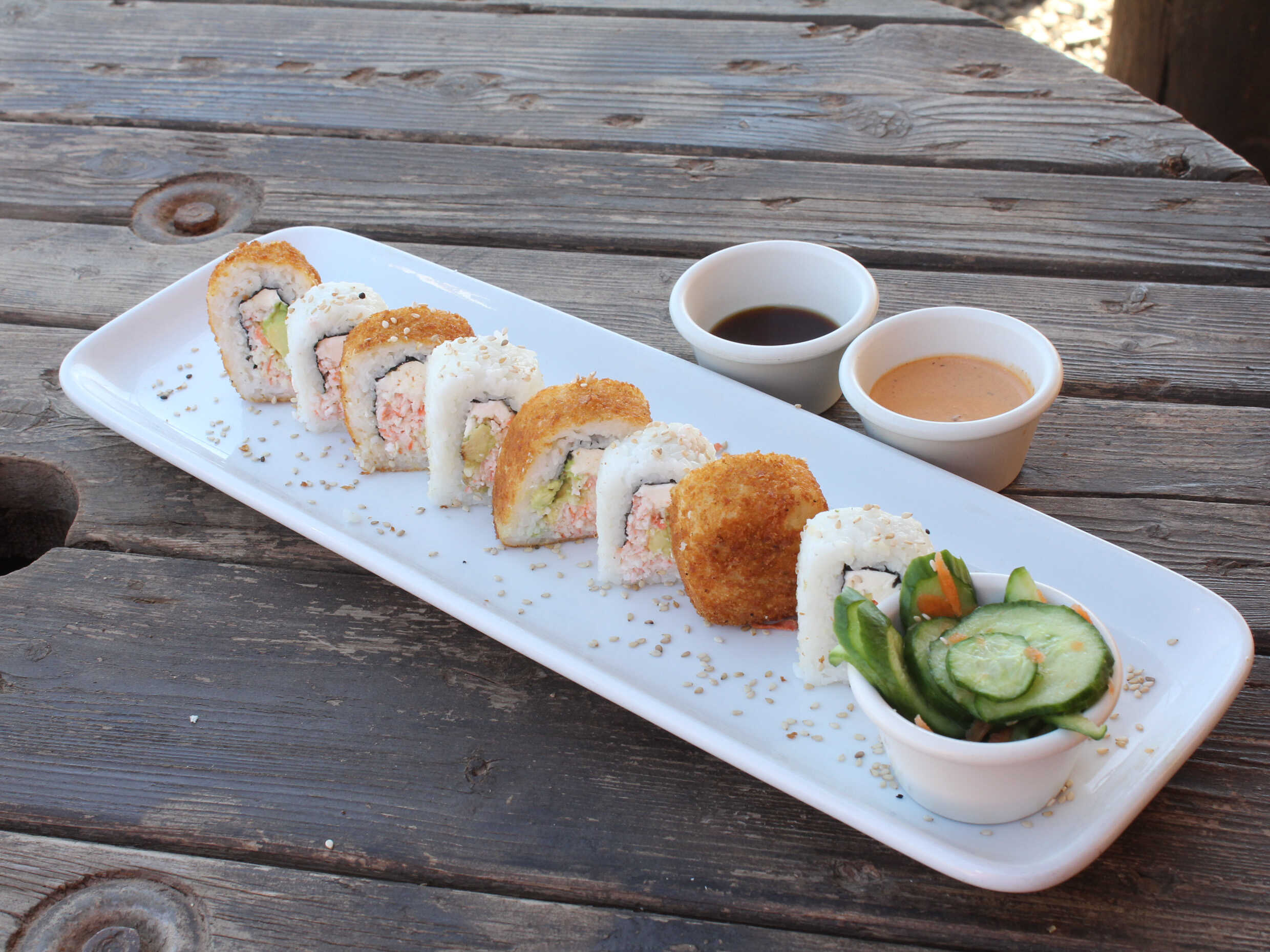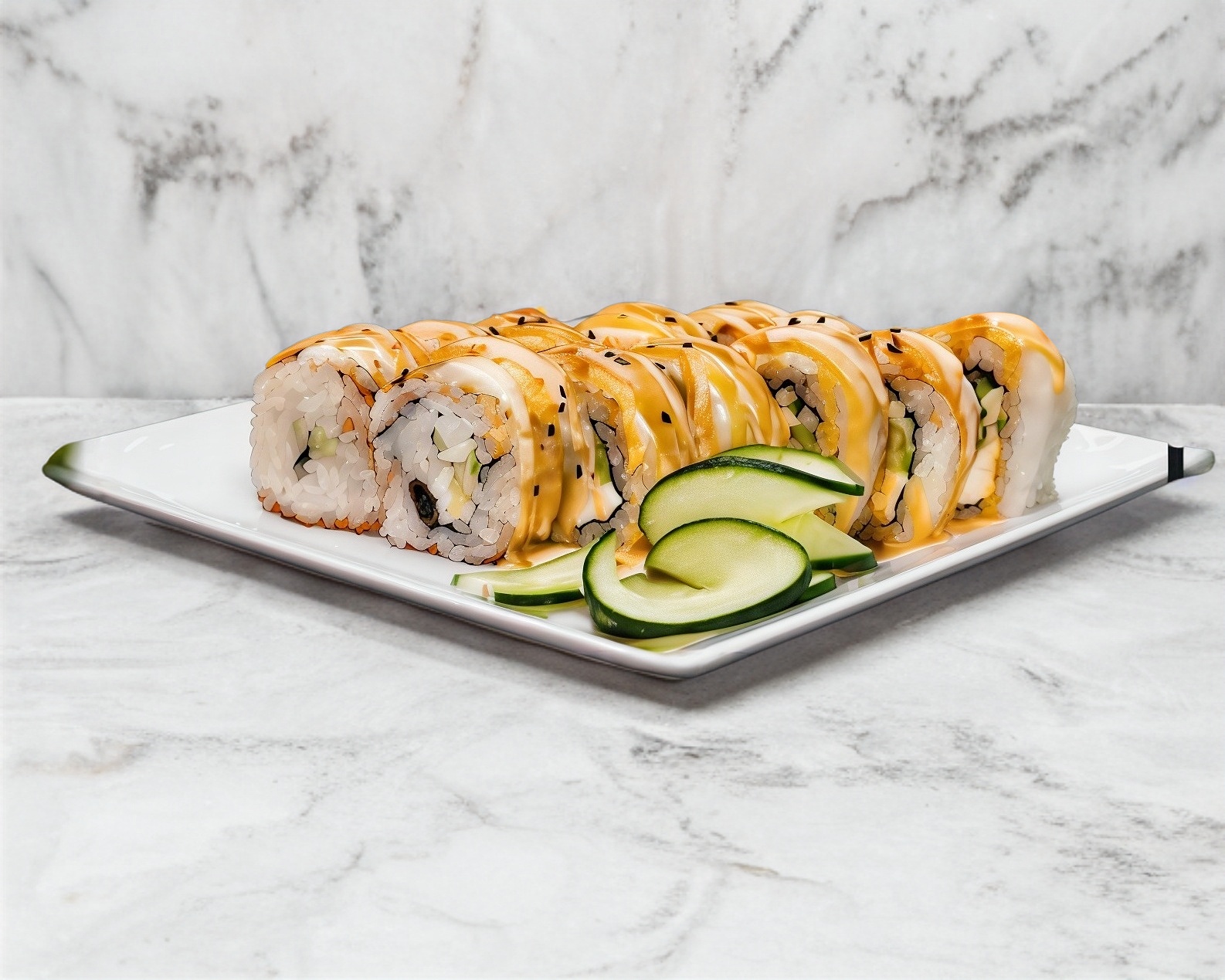 Queso crema, aguacate, pepino, camarón capeado y marlín ahumado.