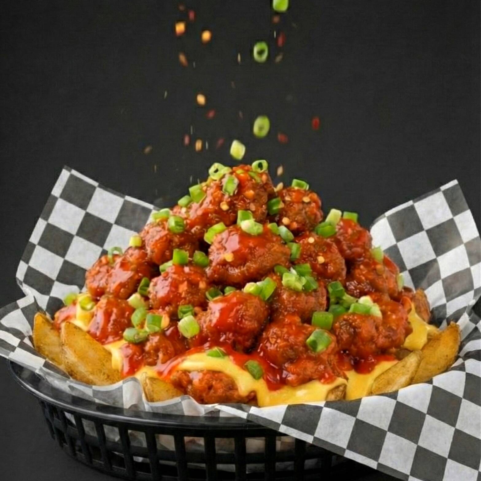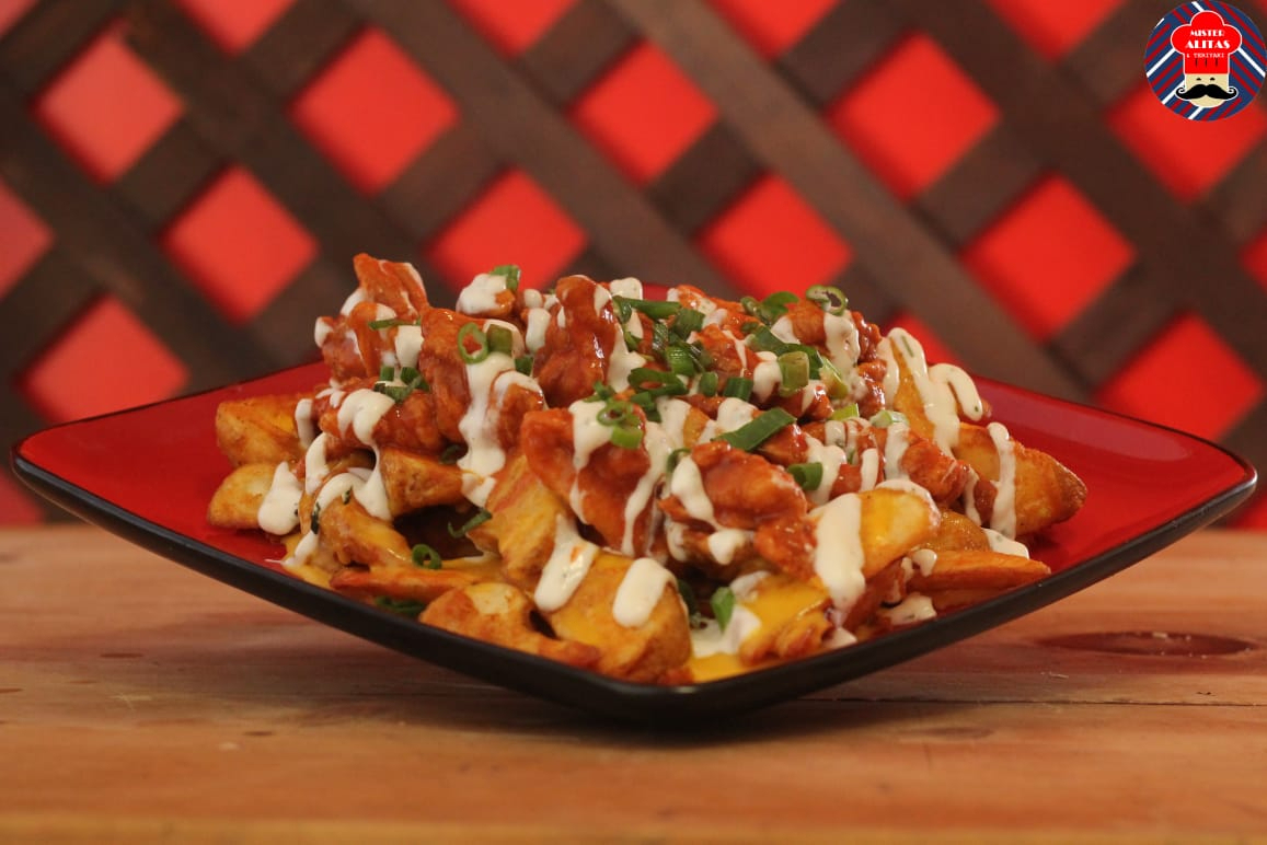 Cama de papa sazonada con queso para nachos, 300 gramos de BONELESS, aderezo ranch y cebollin. IDEAL para 2