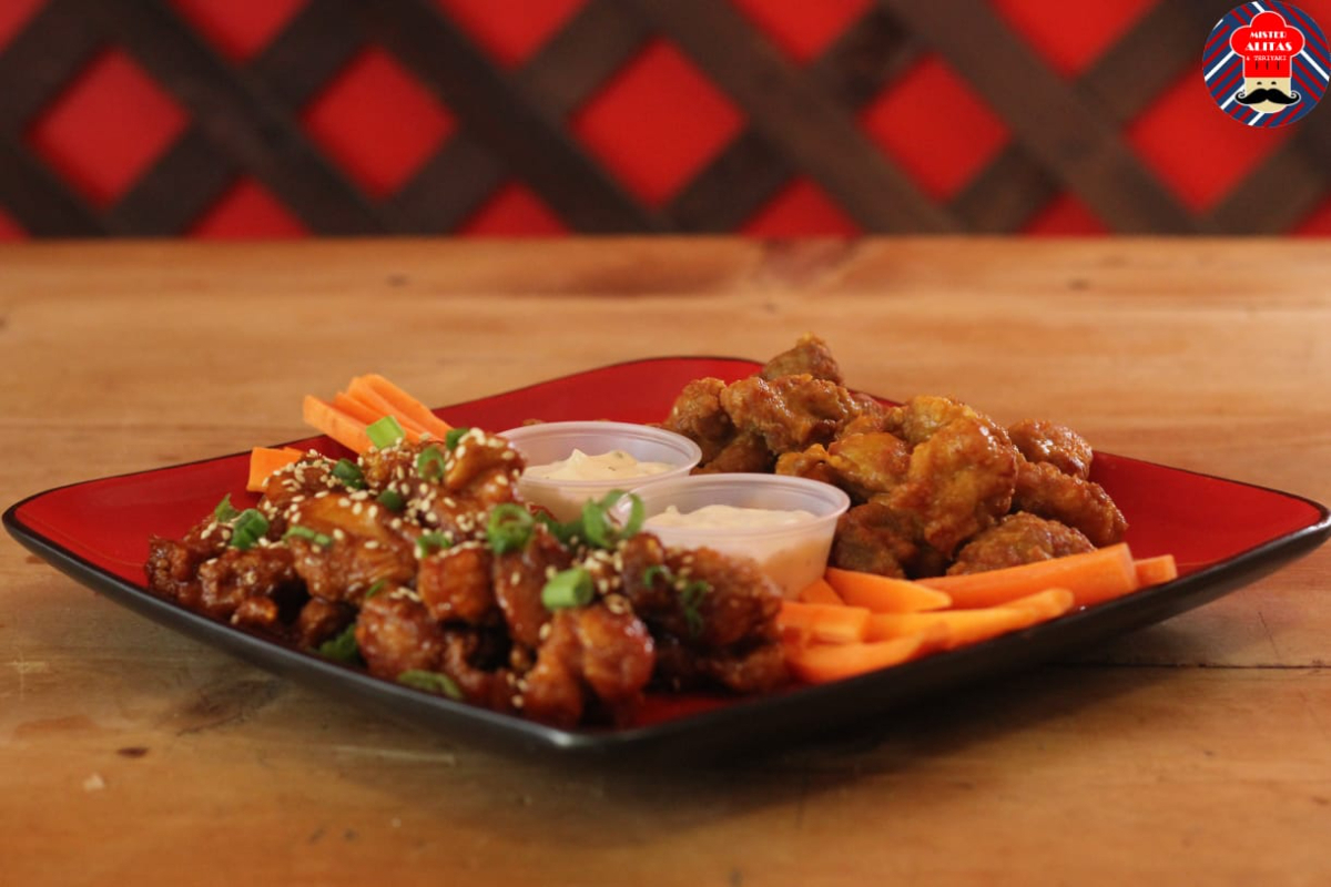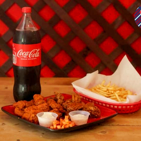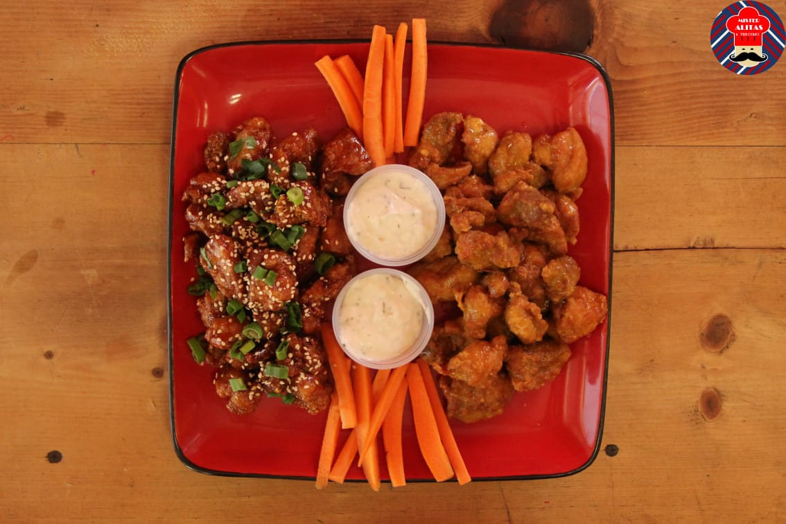 1 KG de boneless en tus salsas favoritas, aderezo ranch y zanahoria.