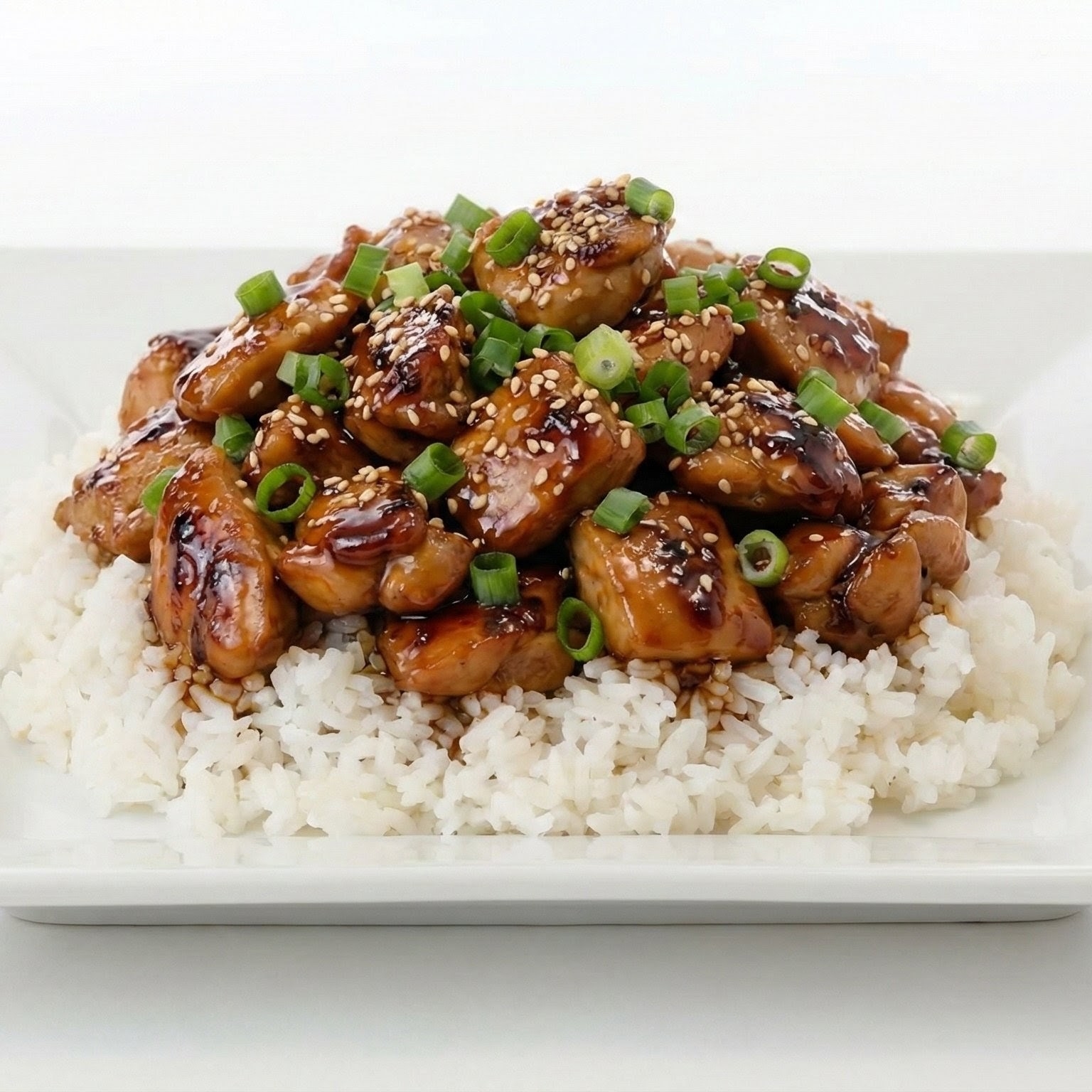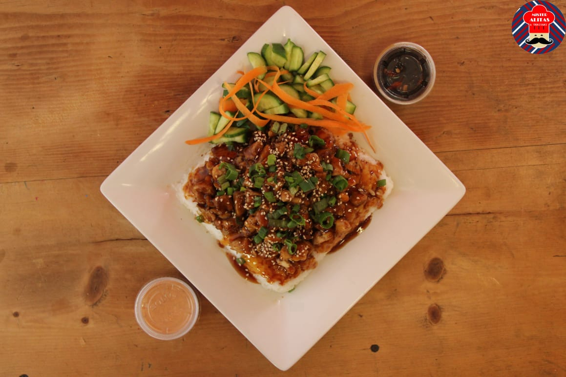 Cama de arroz, pollo a la plancha sin piel, con salsa teriyaki, cebollín y ajonjolí. Incluye: Aderezo chipotle y chiles