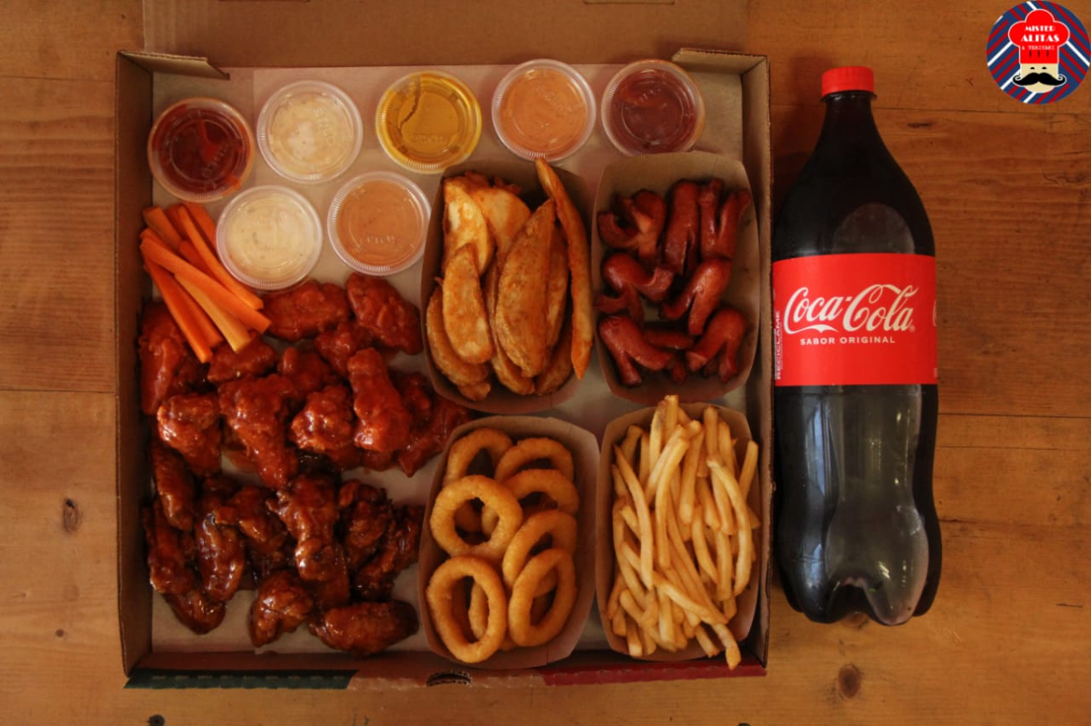 Aros de Cebolla*1 + Soda de 1.5 Litros*1 + Papas a La Francesa*1 + Papas Sazonadas*1 + Salchipulpos*1 + 24 ALITAS*1