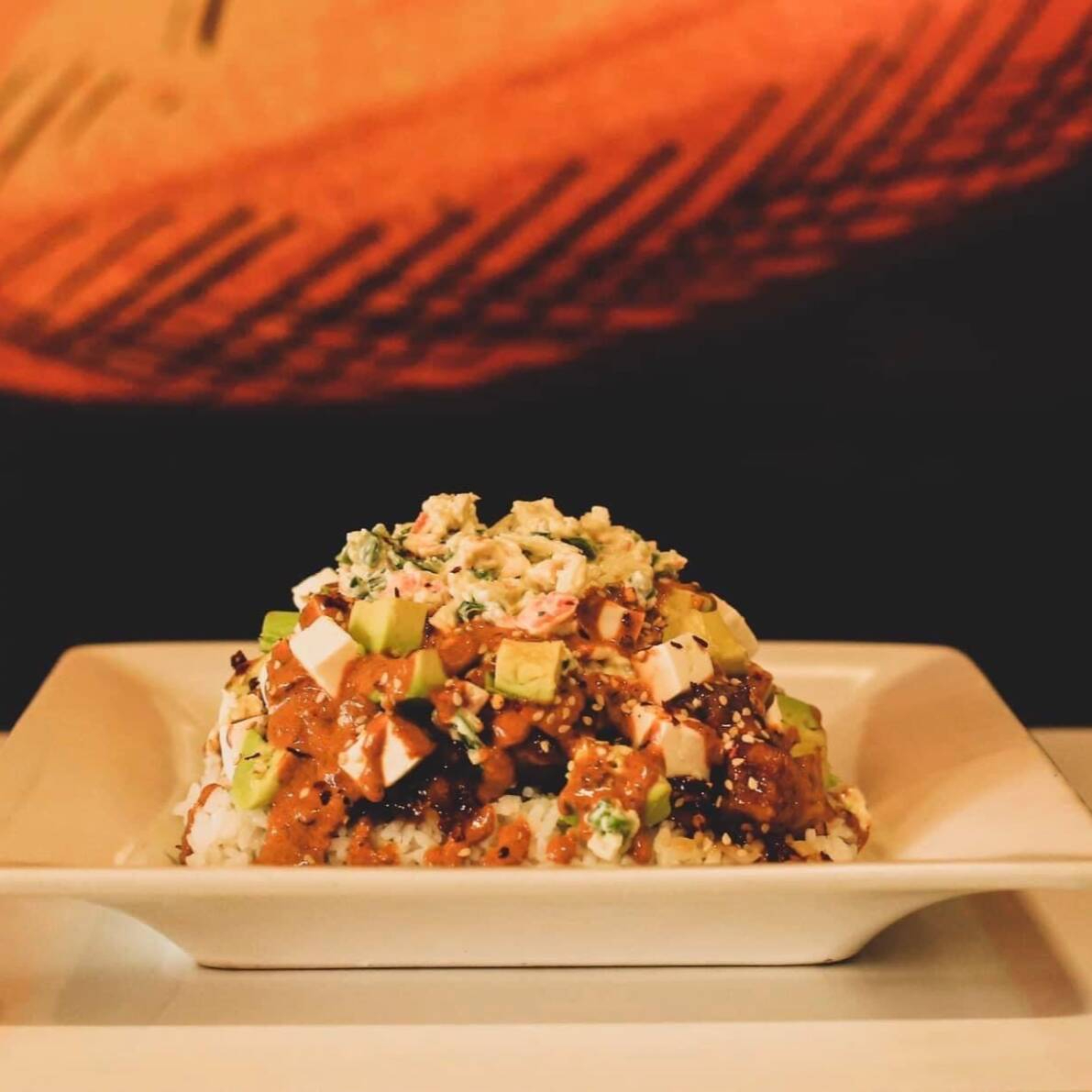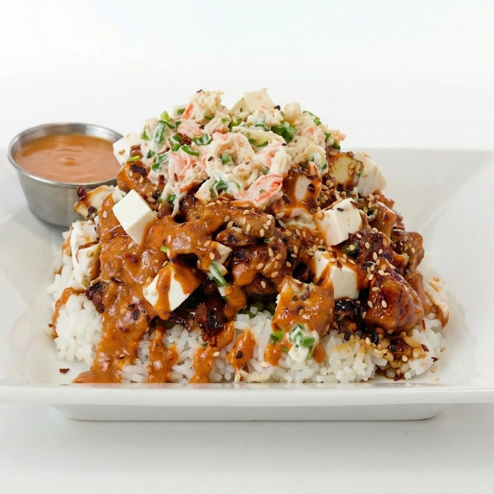 Arroz, pollo frito en salsa teriyaki con chile de arbol, con aguacate, philadelphia, aderezo de chipotle y ensalada de cangrejo.