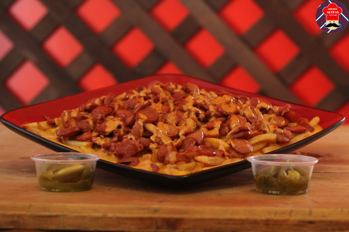 Cama de papas a la francesa, queso para nachos, salchicha, tocino y aderezo chipotle. Acompañado de chiles jalapeños.