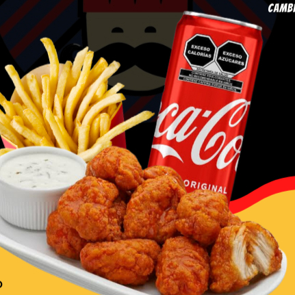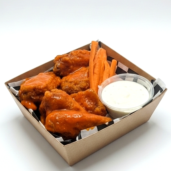 1/2 kg Boneless empanizados y fritos bañados con salsa de tu elección, aderezo ranch y zanahoria.