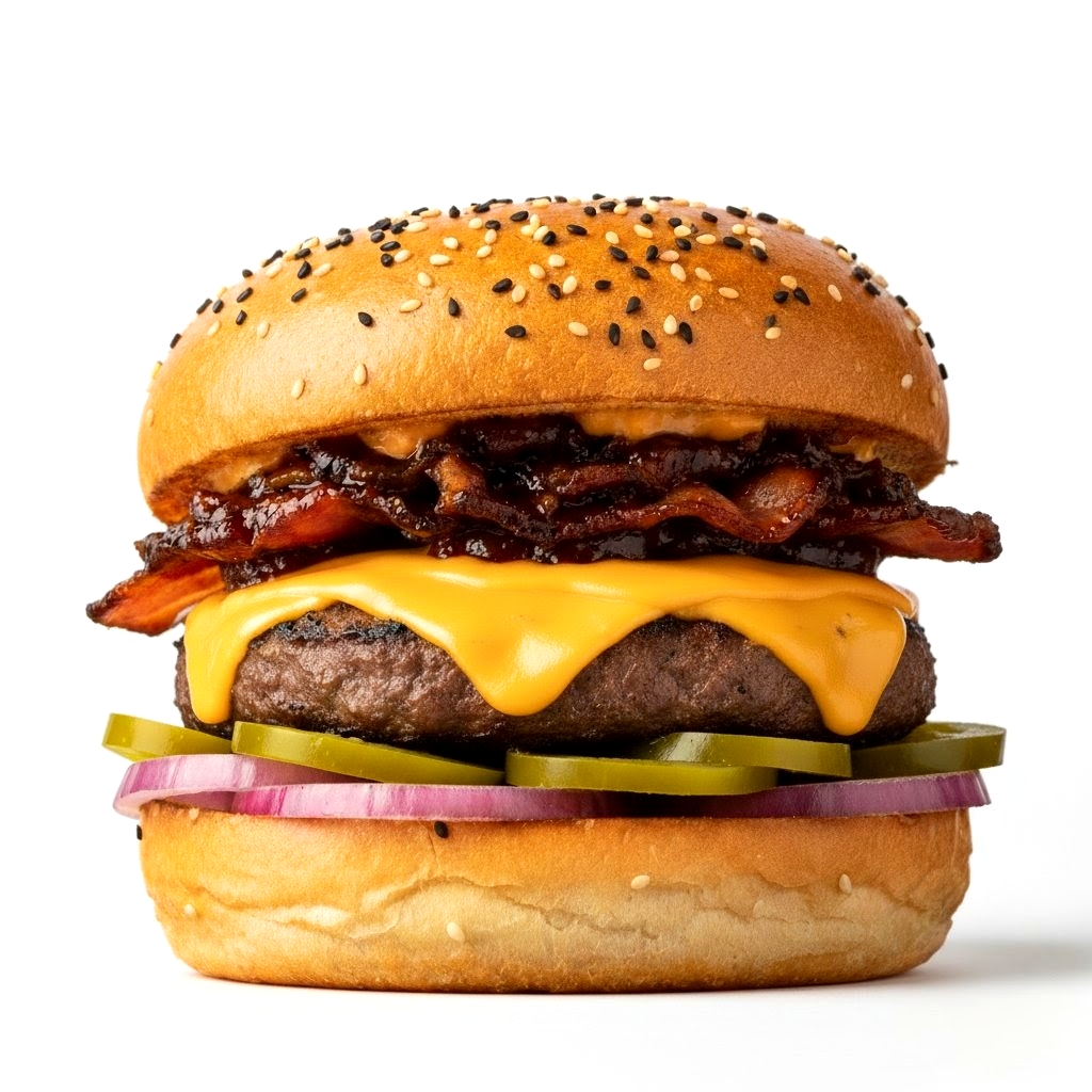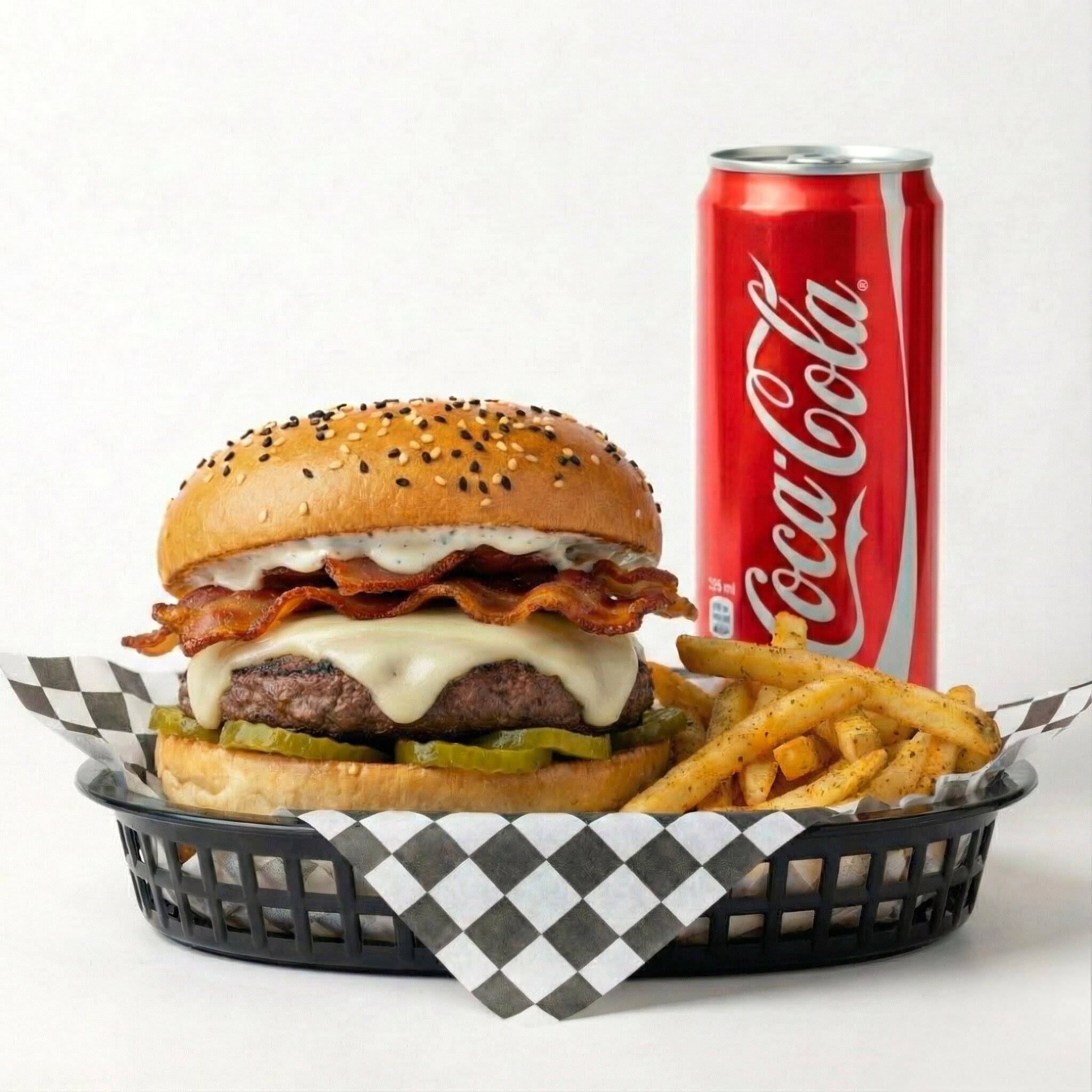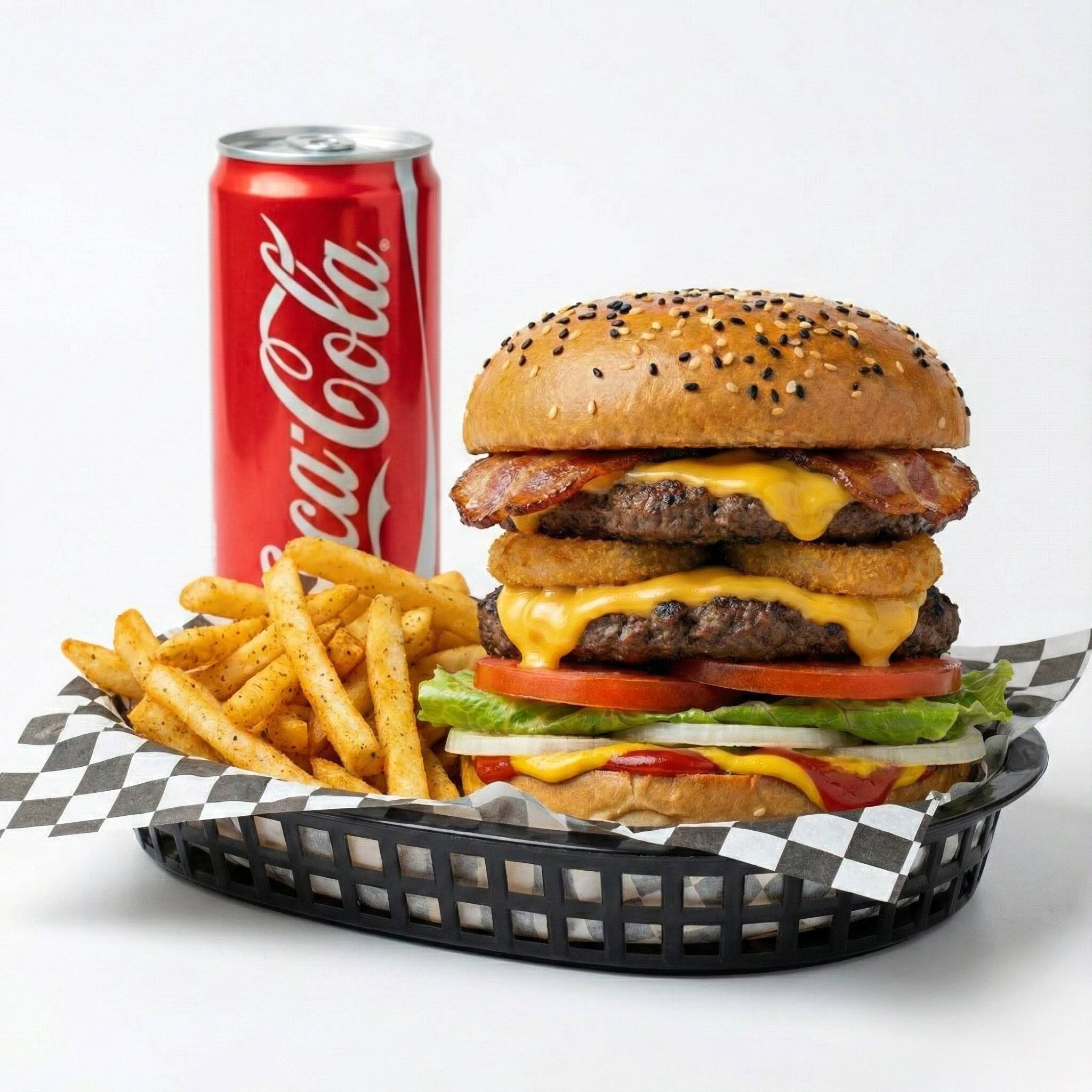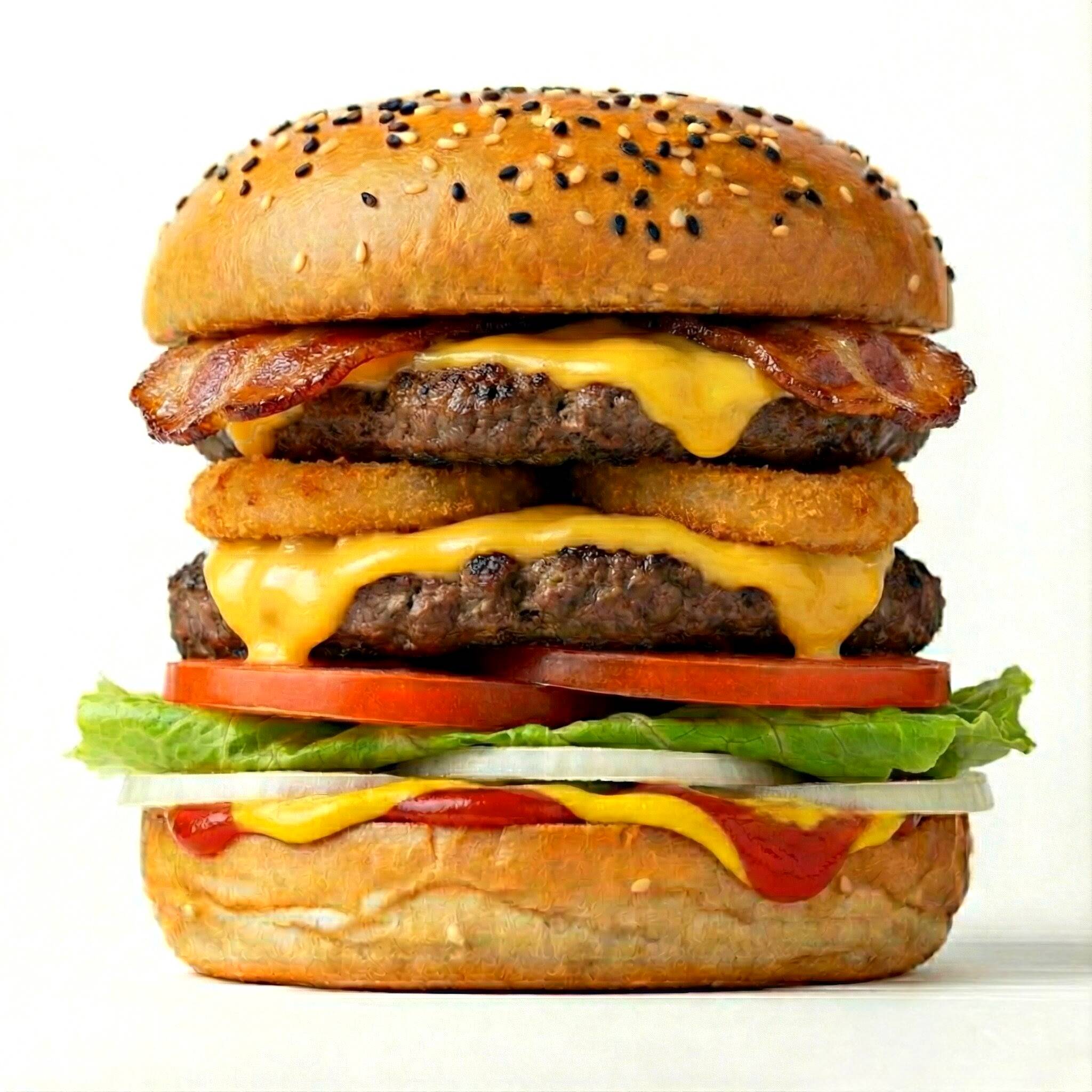 HAMBURGUESA CON DOBLE CARNE DE RES PREPARADA, DOBLE QUESO CHEDDAR, TOCINO, AROS DE CEBOLLA, LECHUGA, TOMATE, CEBOLLA, KETCHUP Y MOSTAZA