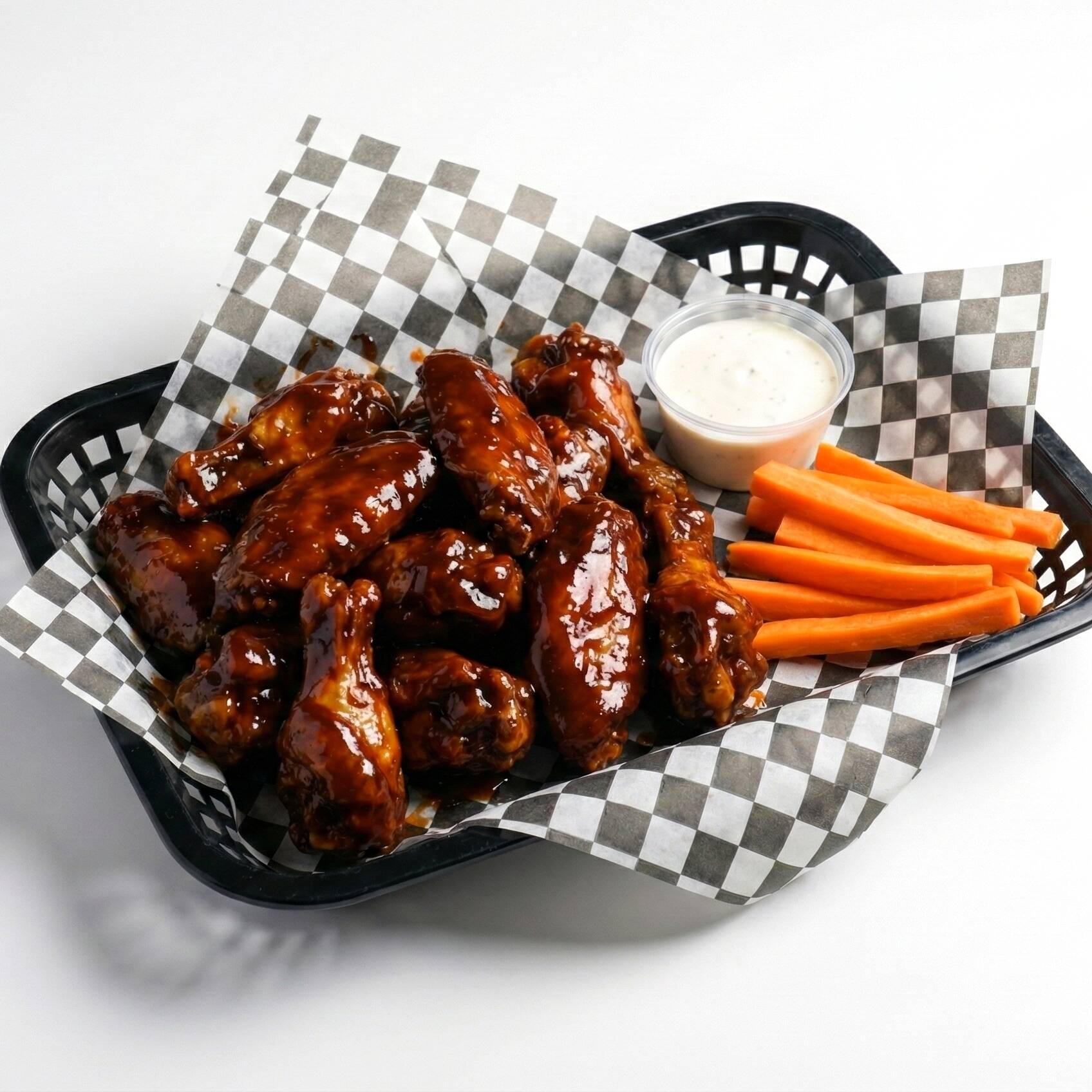 24 de alitas en tus salsas favoritas, aderezo ranch y zanahoria. (son aprox entre 24 y 28 piezas varia depende el tamaño)