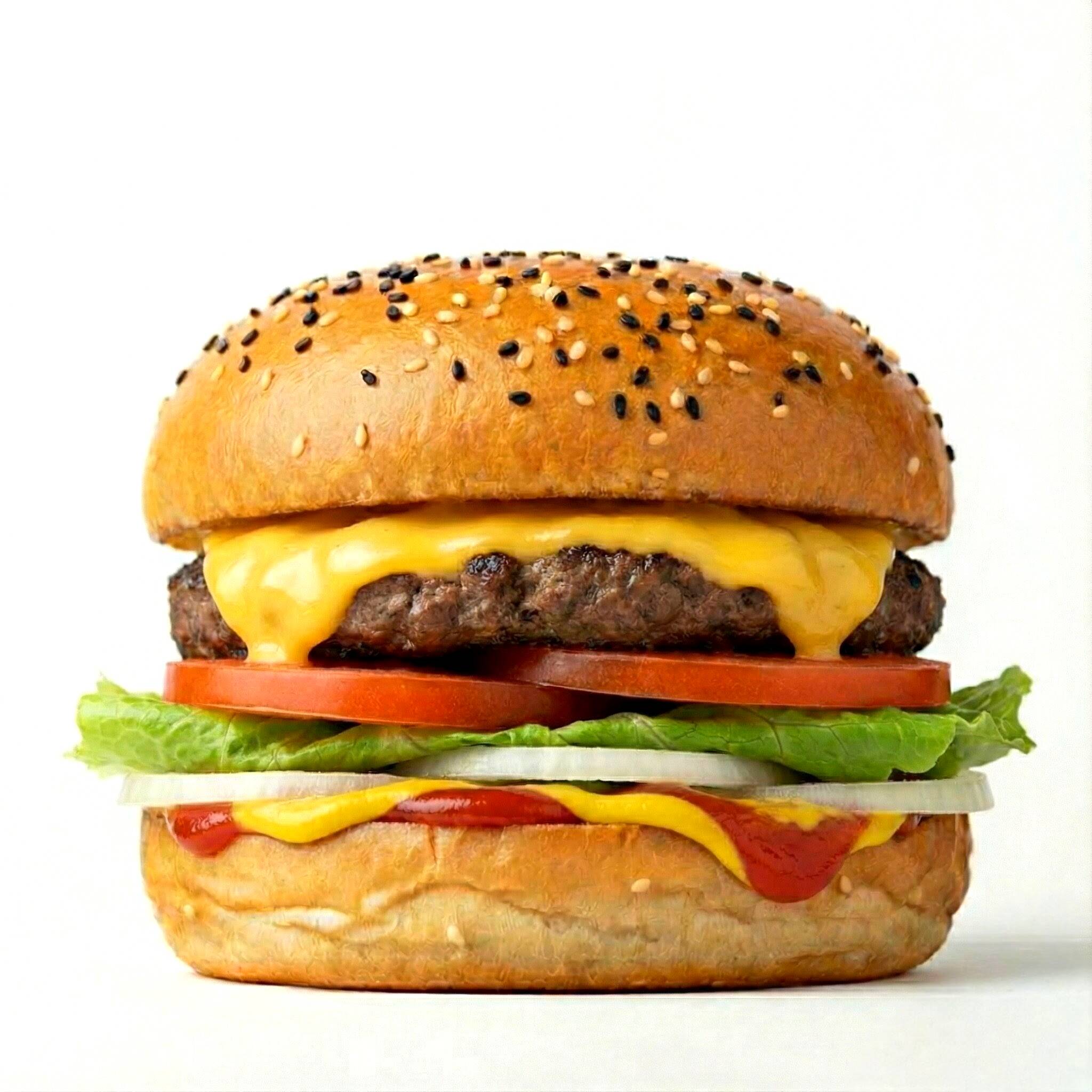 pan artesanal, carne de res preperada,queso cheddar, lechuga, tomate, cebolla, mostaza y ketchup.