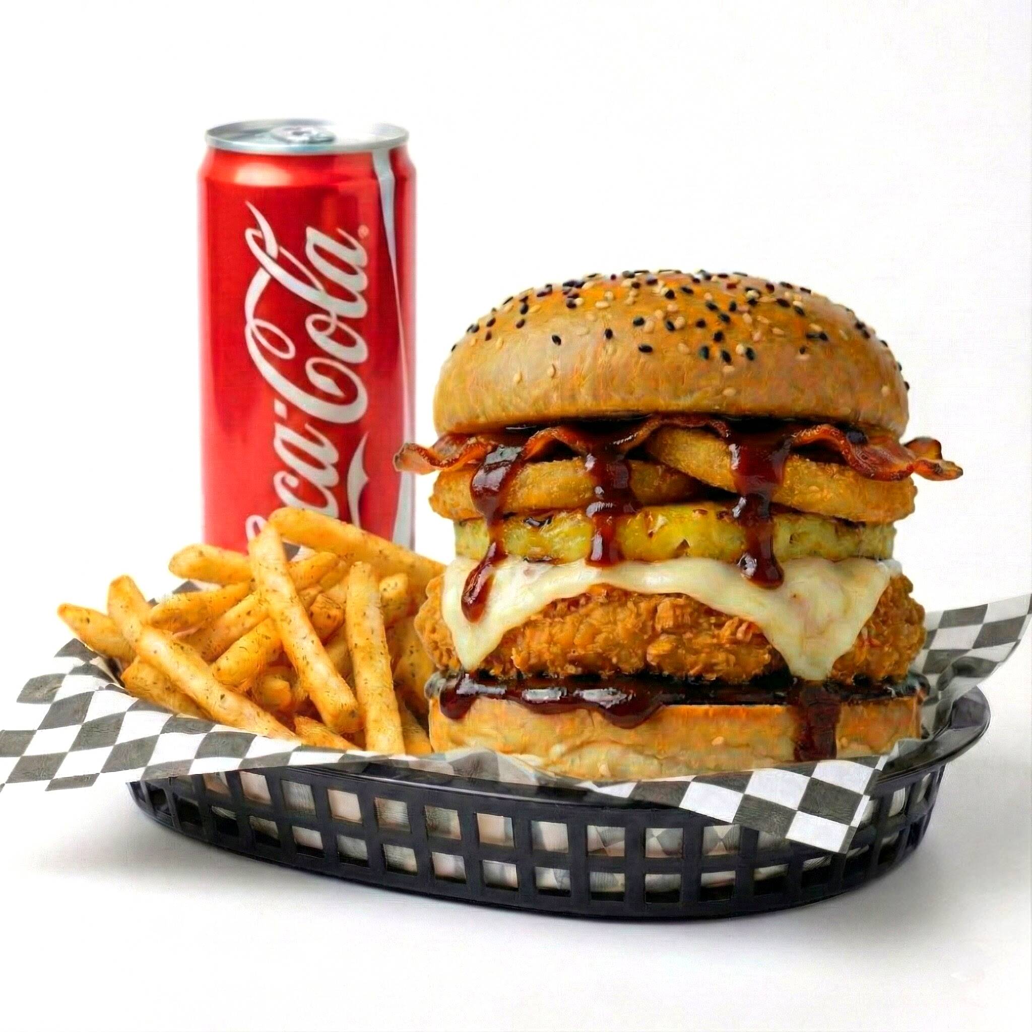 HAMBURGUESA CHICKEN BBQ*1 + Papas a La Francesa*1 + Bebida*1