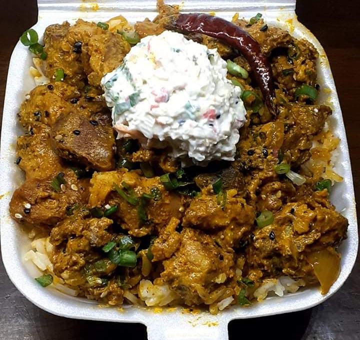 Pollo al curry con arroz, sushi, 3 rollo de queso crema y ensalada tampico de surimi.