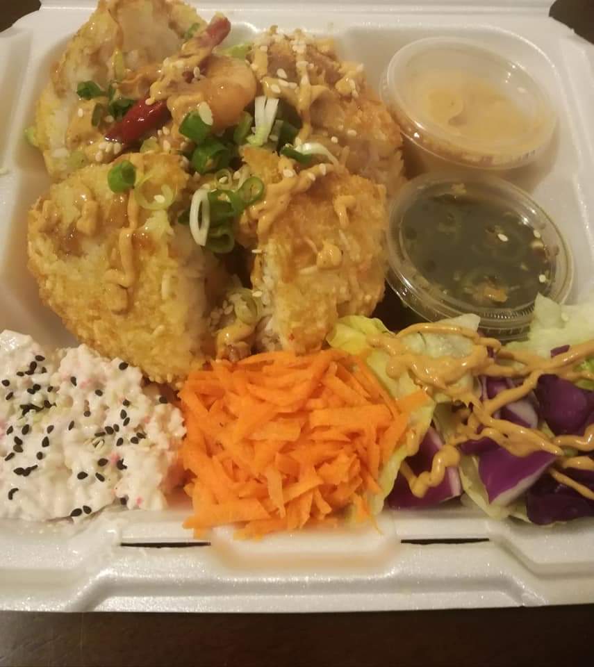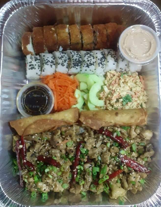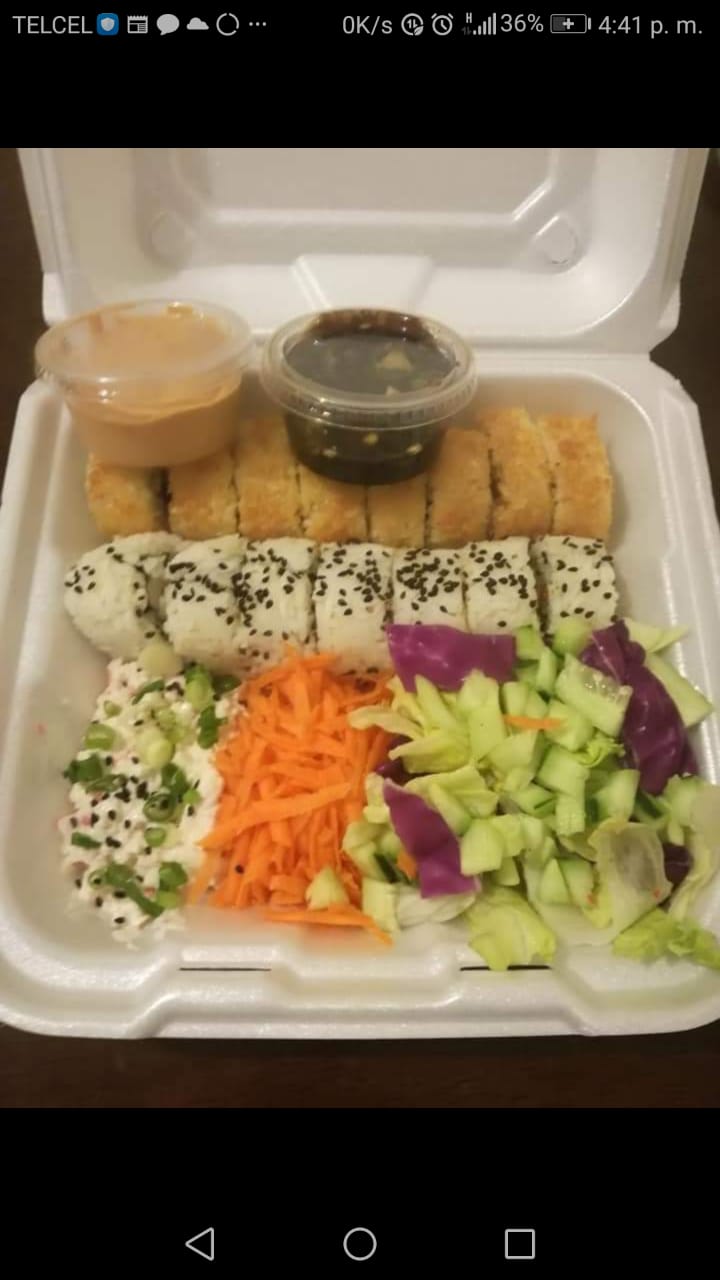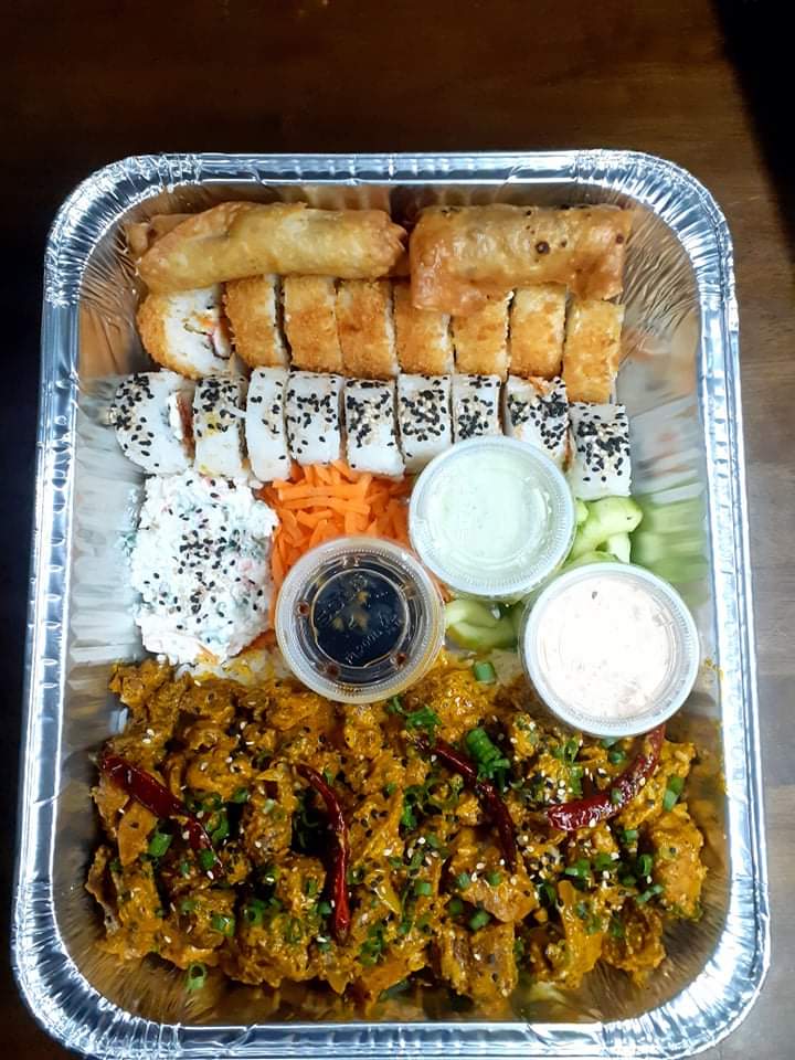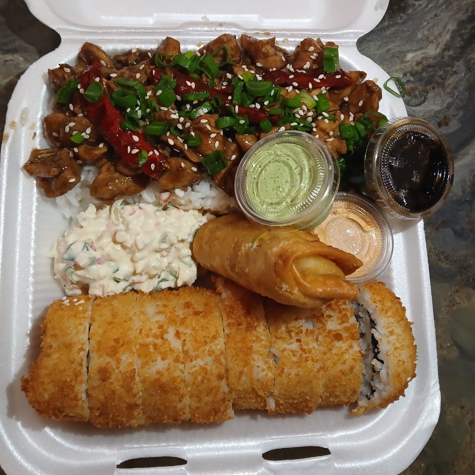 Pollo al curry con arroz, sushi, 5 rollos de queso crema y ensalada tampico de surimi.