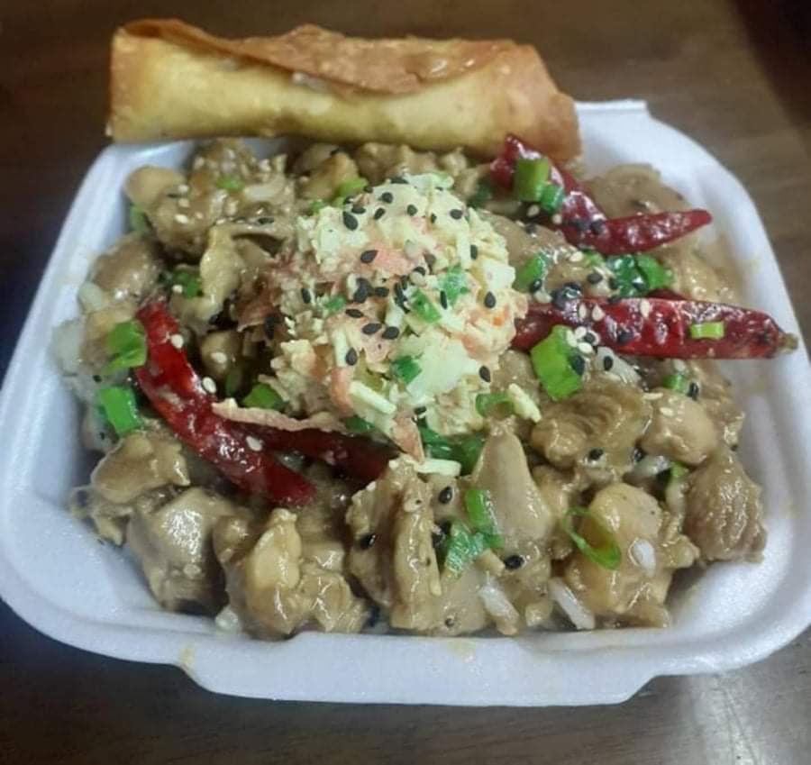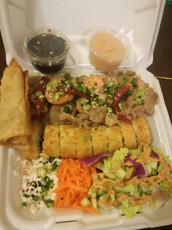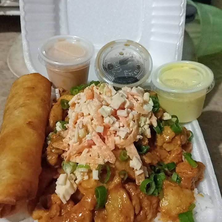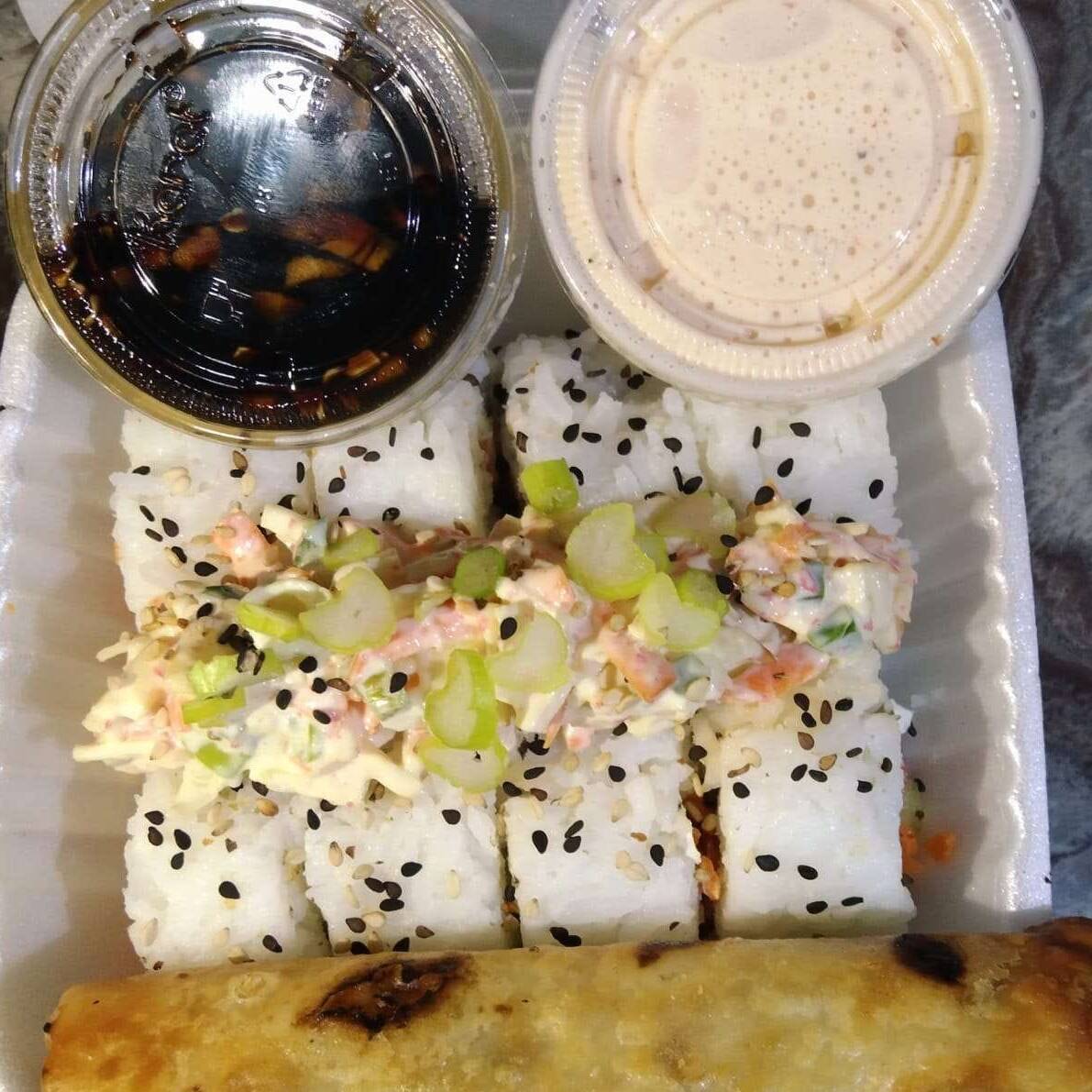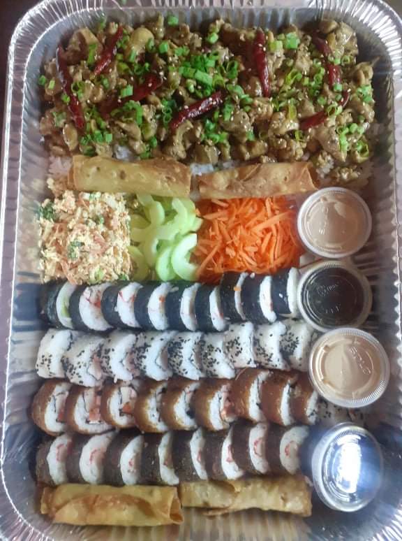 Pollo al curry con arroz, sushi, 5 rollos de queso crema y ensalada tampico de surimi.