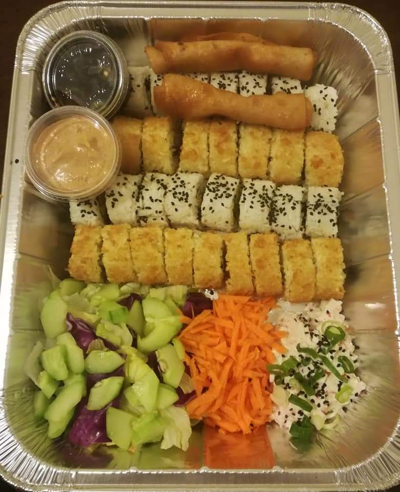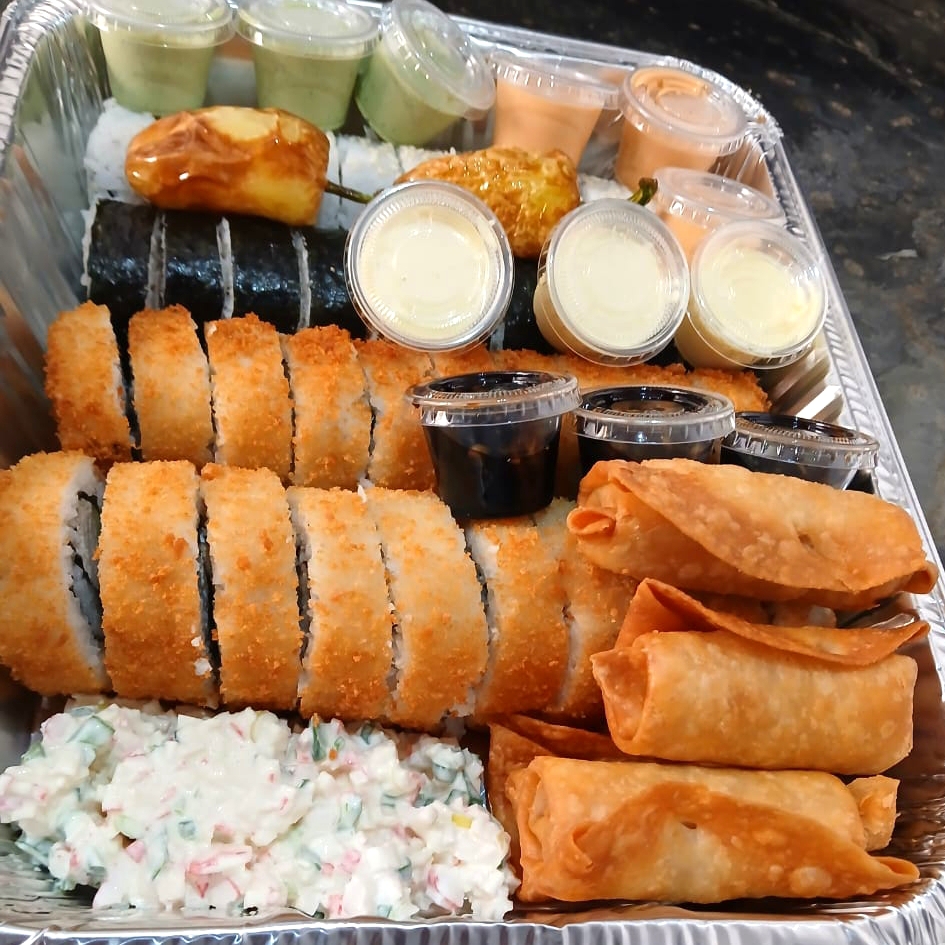 Charola de 2 rollos de sushi y teriyaki con 3 rollos de queso crema y ensalada de surimi con aderezos.