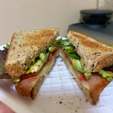 Pan dorado, 2 rebanadas de jamón de pavo, queso monterey, lechuga, tomate, mayonesa