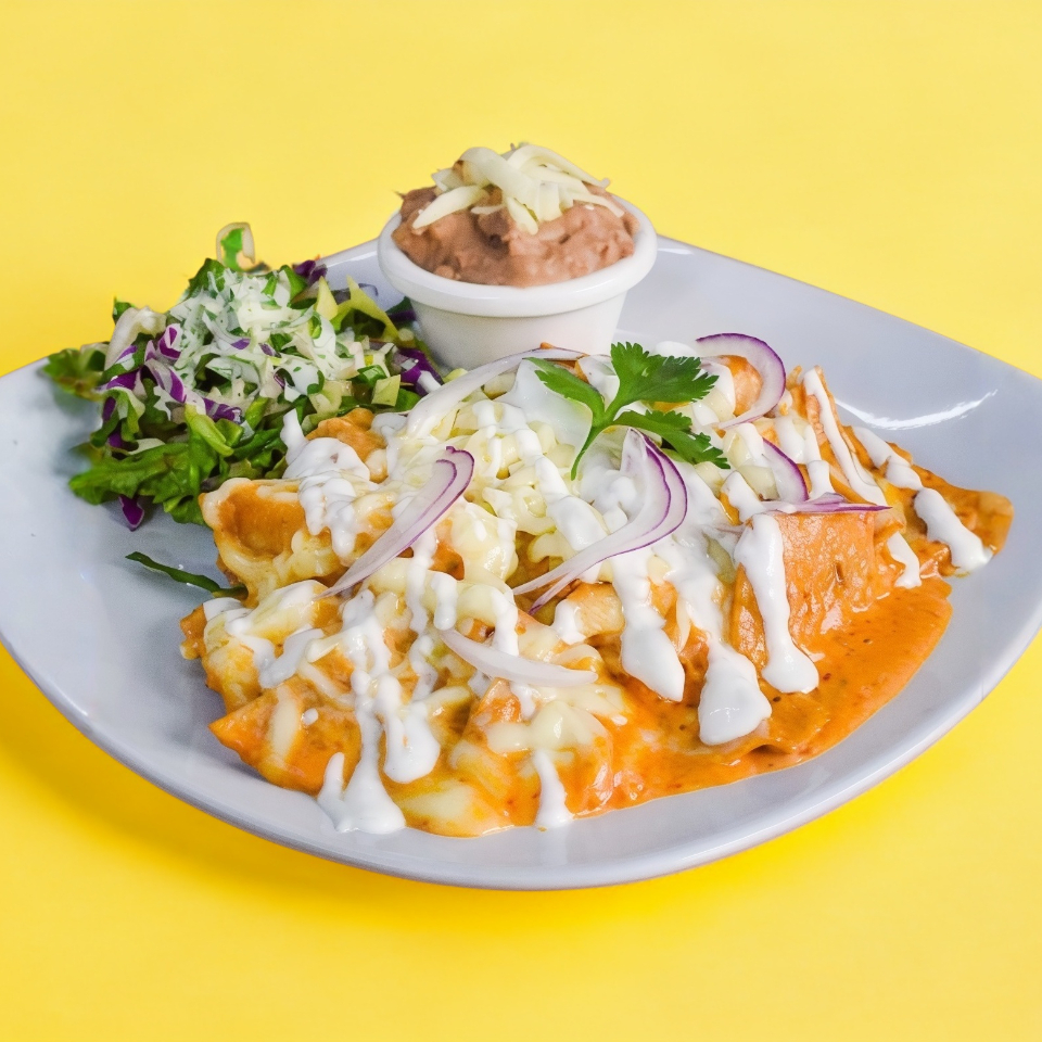 De queso monterrey acompañado de papá rallada, frijoles y pan tostado.