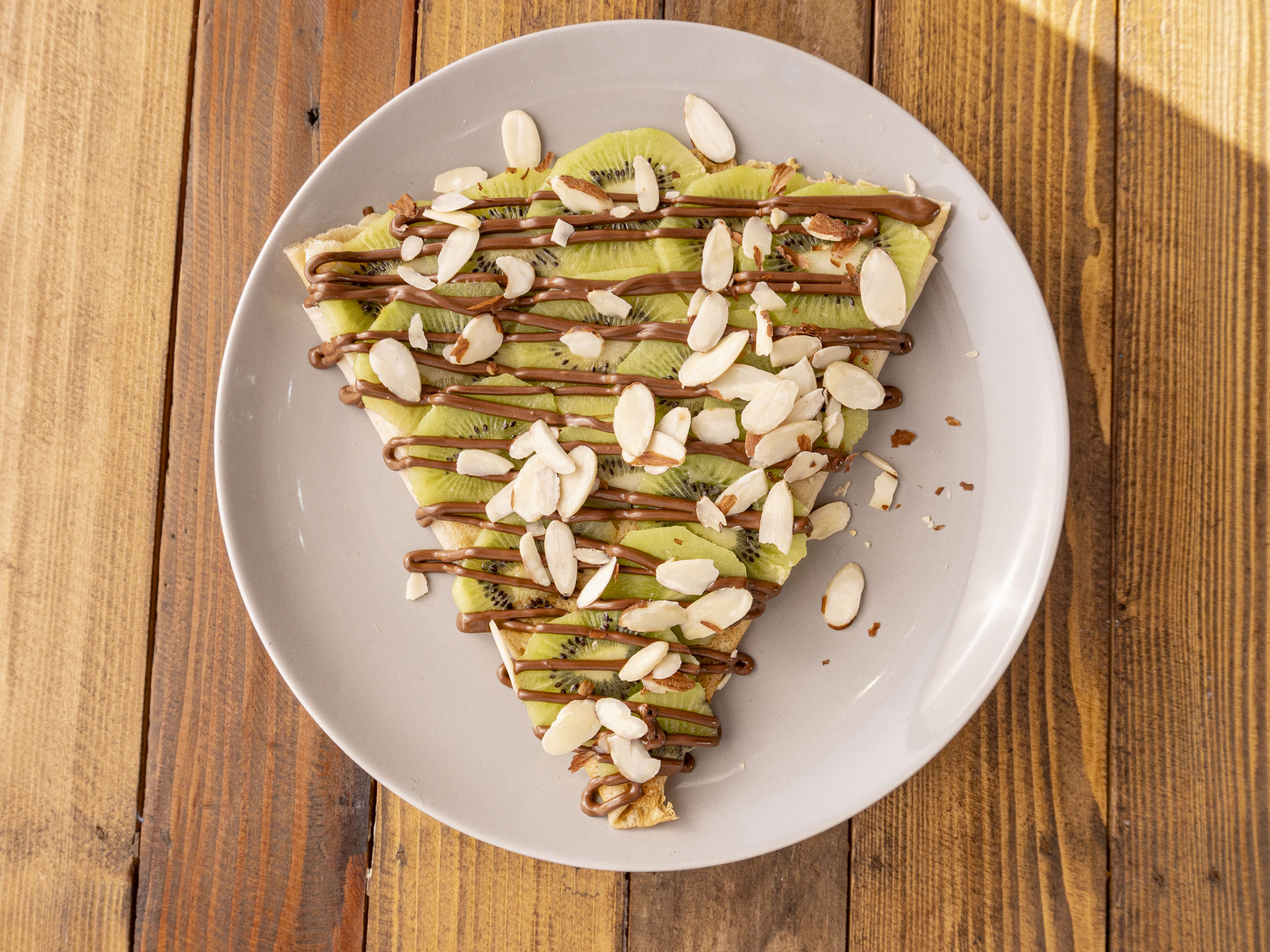 Queso Philadelphia, cubierta de bastantes rebanadas de kiwi, bañada en Nutella, hojuelas de almendras.