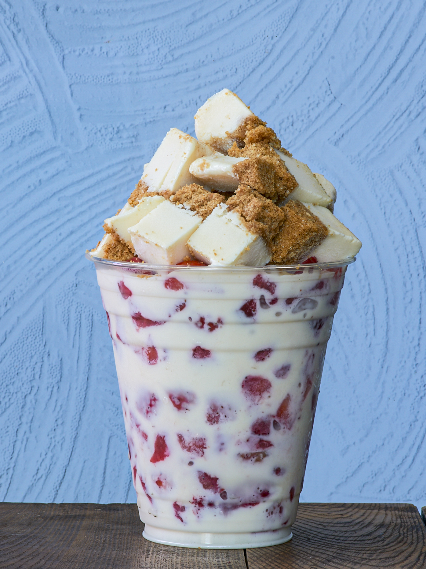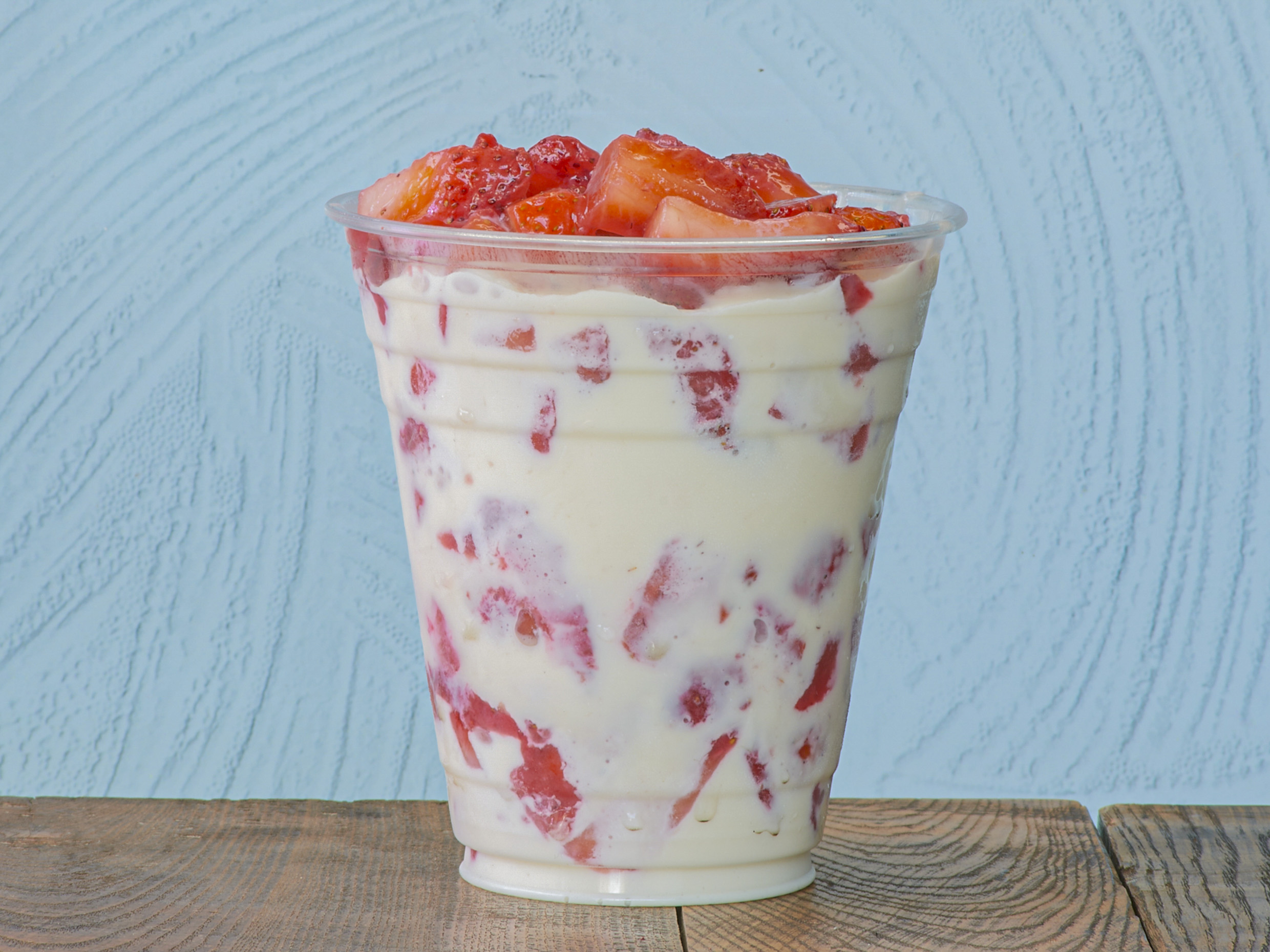 Base de queso philadelphia, rellena de nuestras clasicas fresas con crema, cubierta con crema batida y lechera