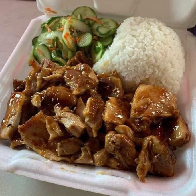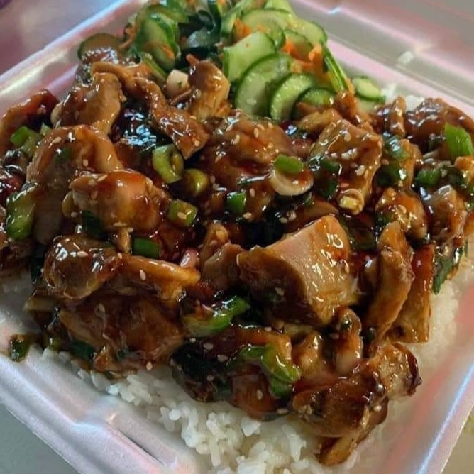 Pollo a la plancha guisado con jalapeño, cebollín y ajonjoli servido en una cama de arroz blanco con ensalada de pepino