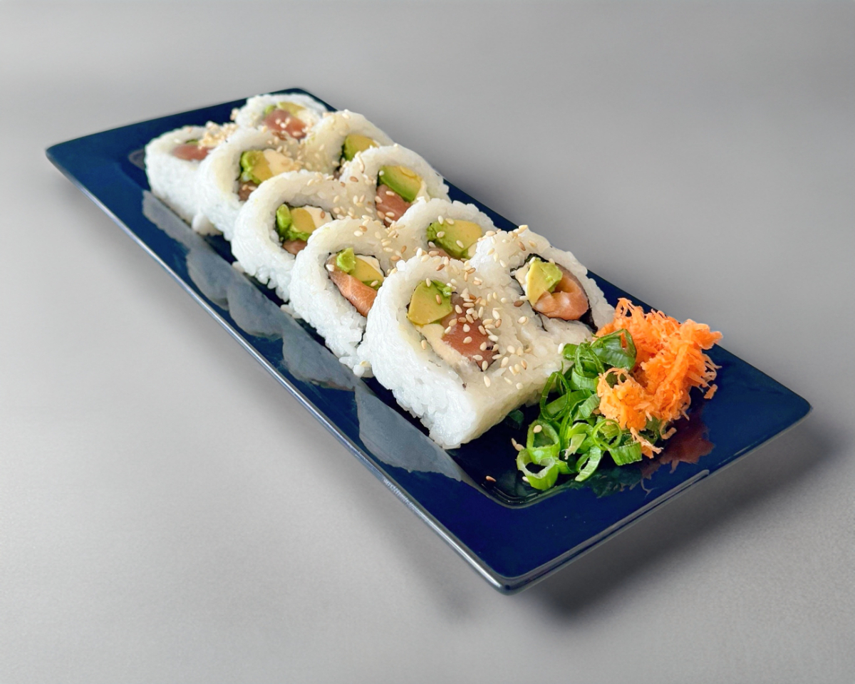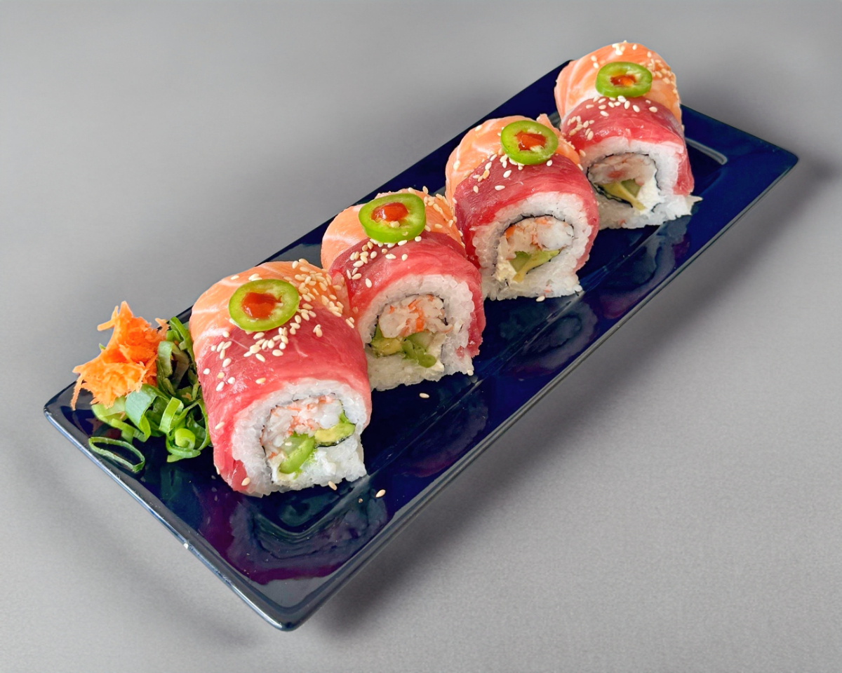 Surimi, queso crema, aguacate, camarón. Forrado de atún y salmón con laminas de serrano