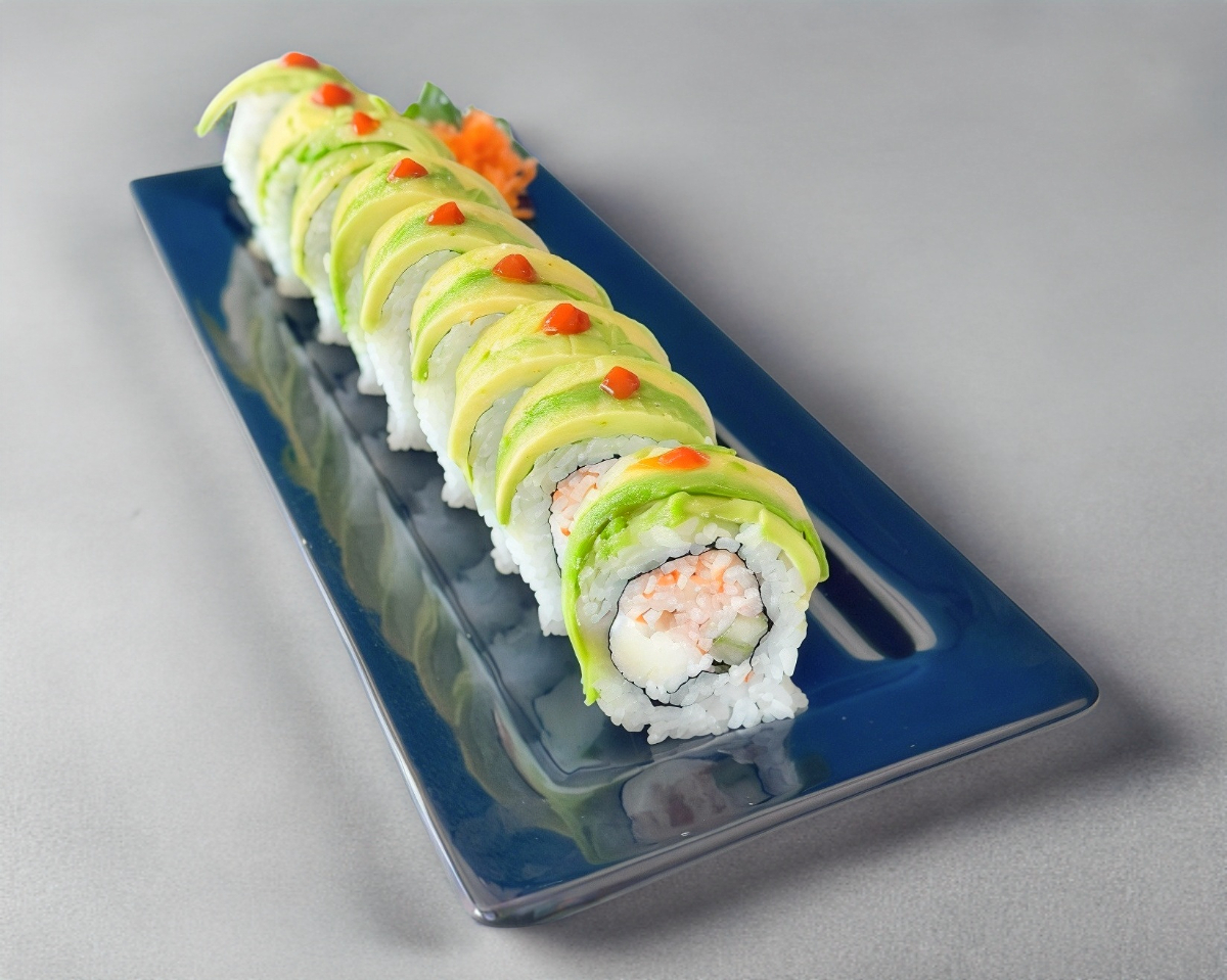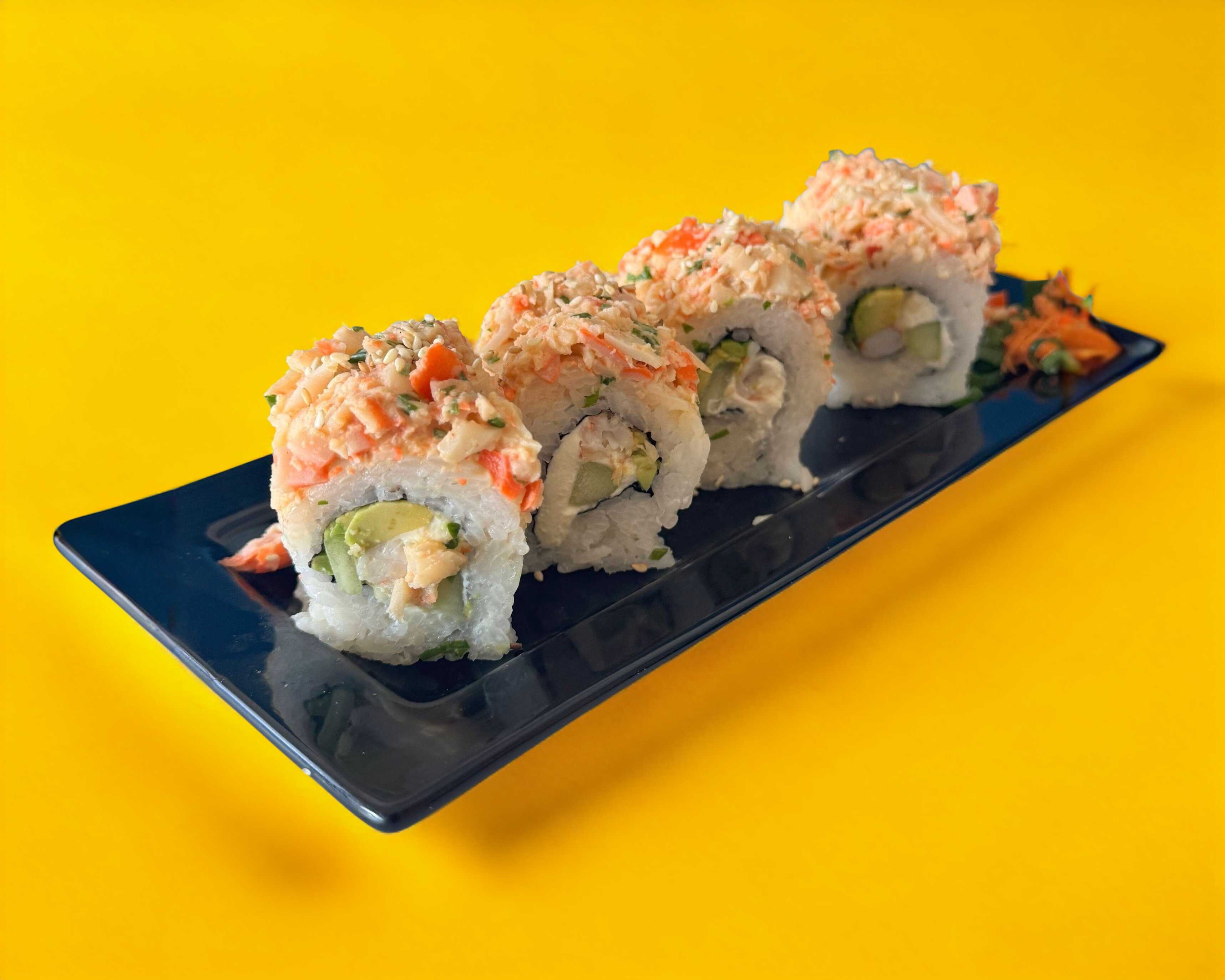 Cangrejo, aguacate, pepino queso crema, forrado de queso y kamikama