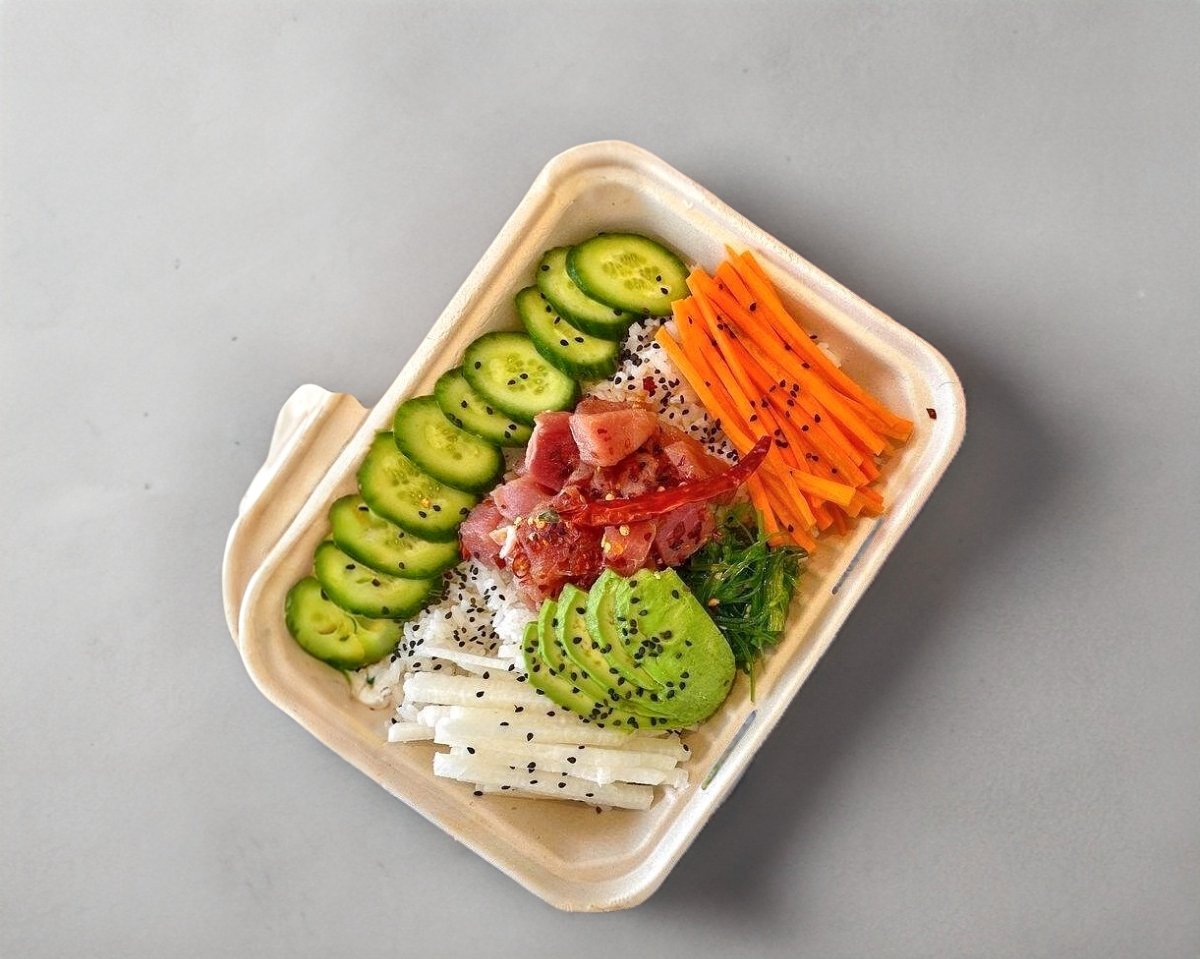 Cama de arroz con cubos de Atun picoso, Wakame, Masago, Jicama, Pepinillo, Zanahoria, Aguacata, Repollo Morado