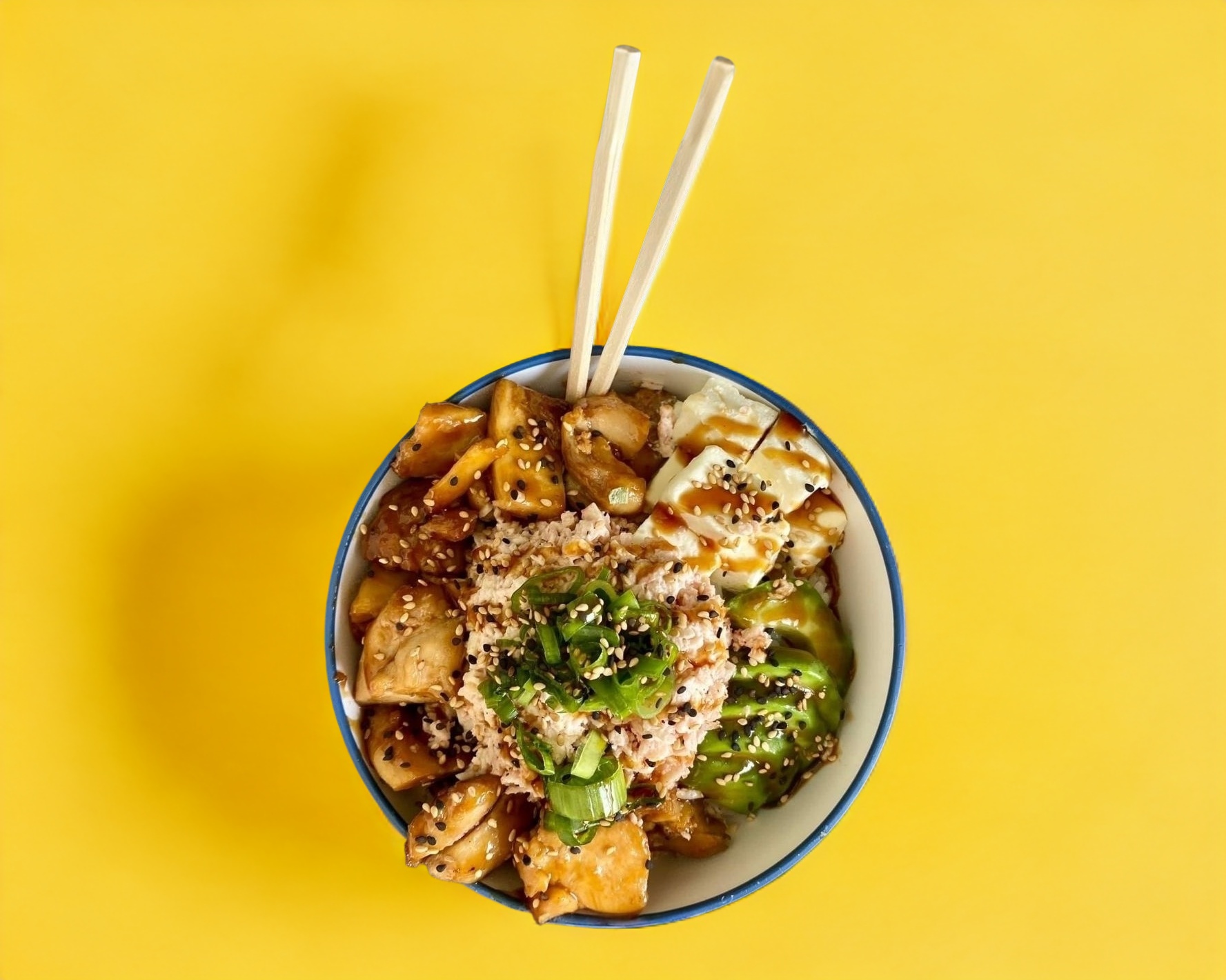 Pollo a la plancha en salsa teriyaki con tampico, queso crema, aguacate sobre una cama de arroz frito con verdura