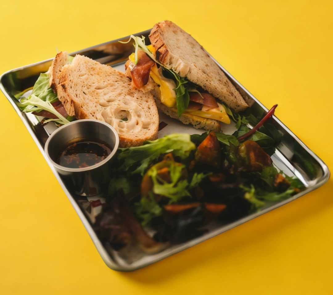 Pan Hogaza masa madre, Alioli de ajo rostizado con pepinillos, Huevo revuelto, Queso Suizo, Tocino y lechugas mixtas