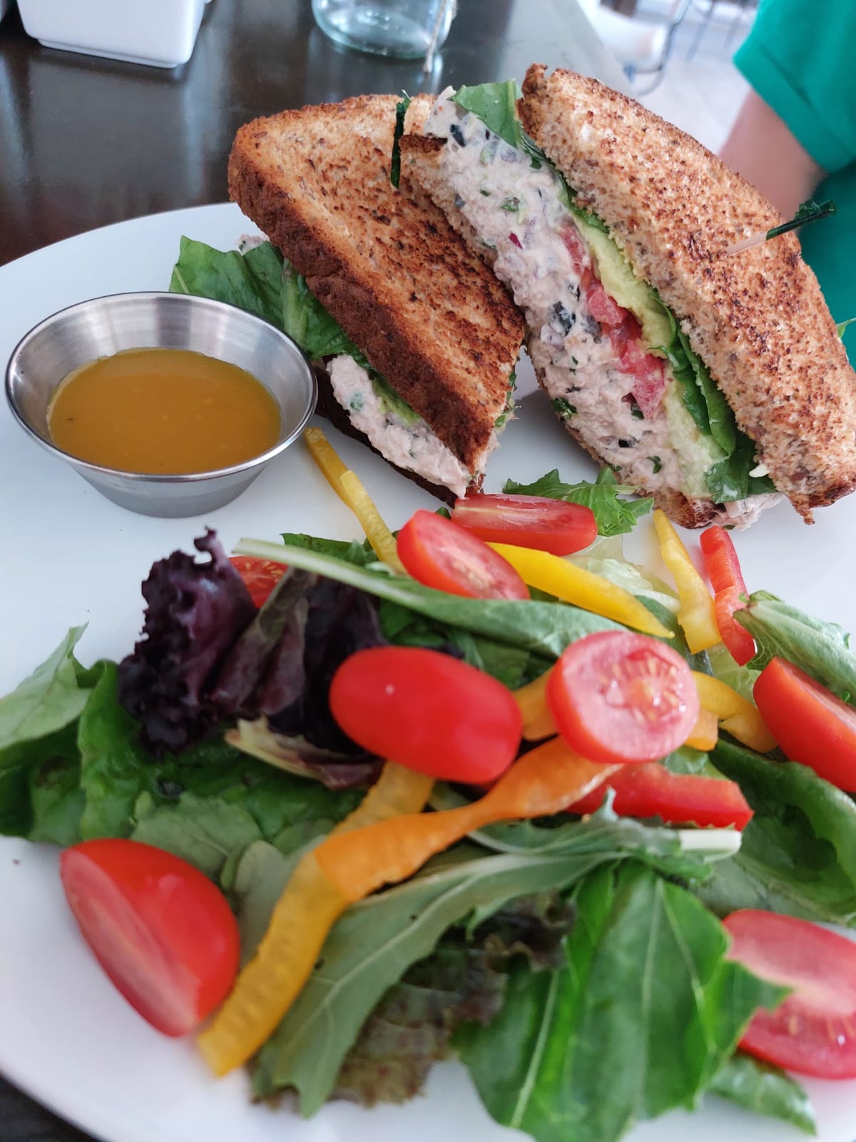 Atún, cilantro, cebolla morada, pimiento rojo, aceituna, lechuga.