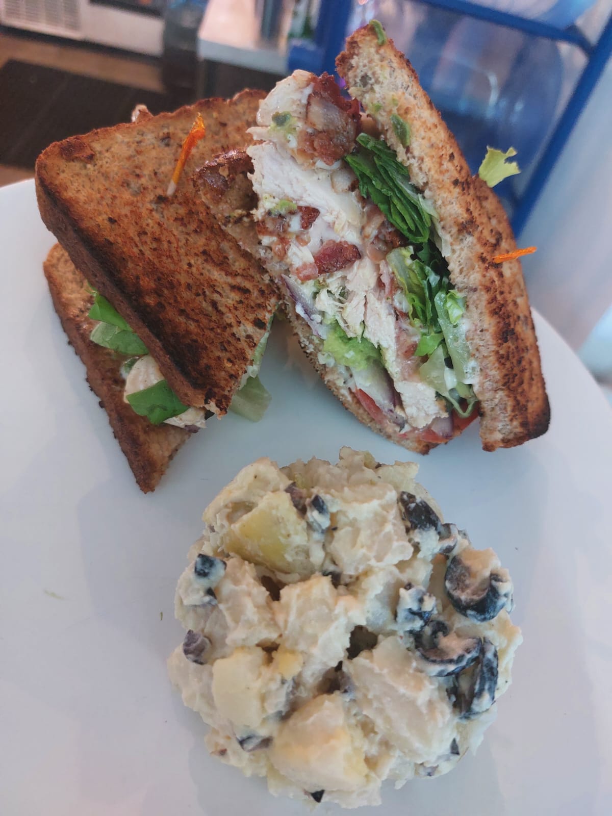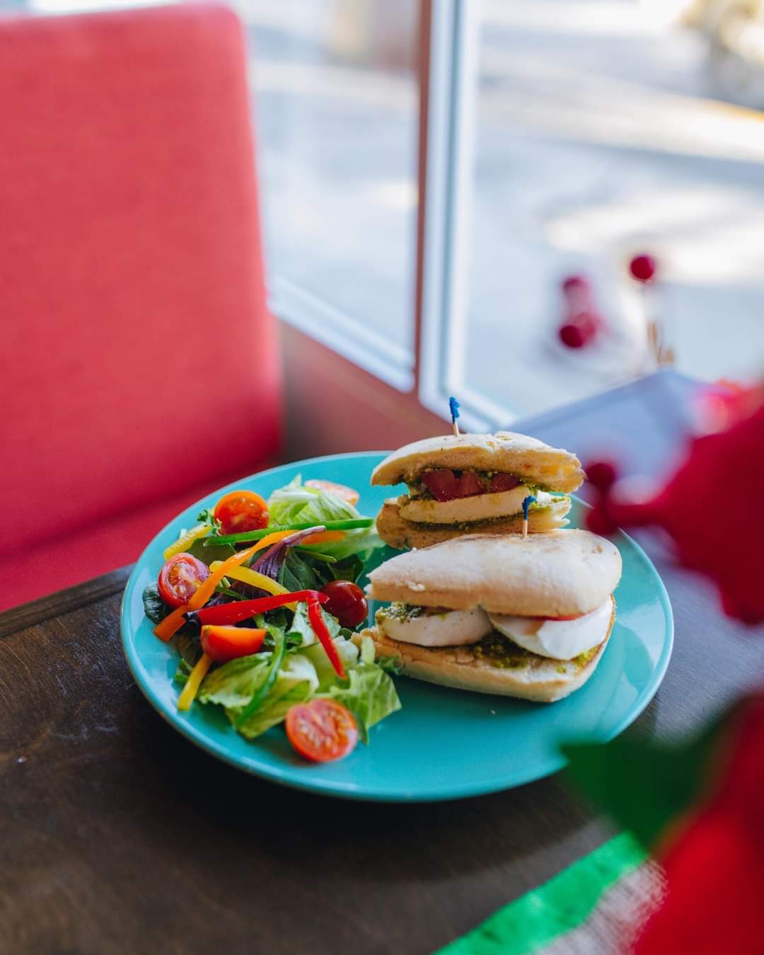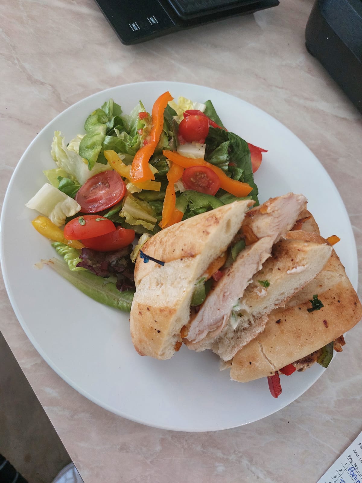 Pechuga de pollo, pimiento morrón, cebolla morada, mayonesa mediterránea.