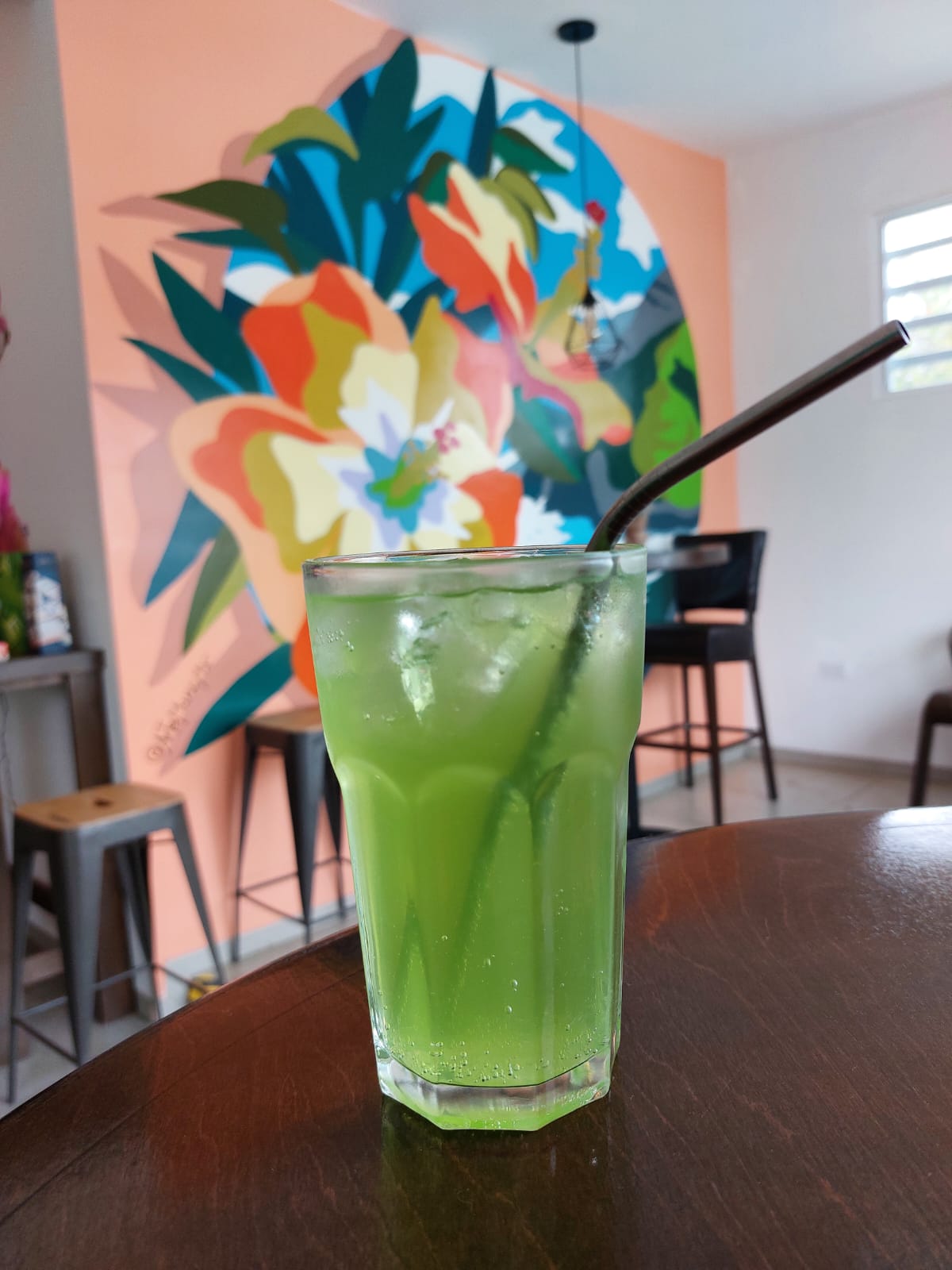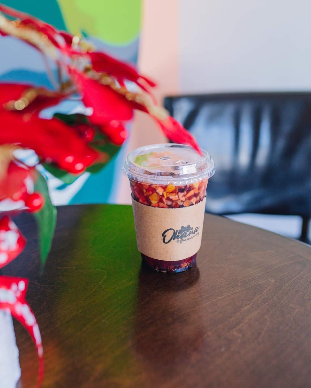 Polvo chai, jarabe de frambuesa y leche (vaso de 16oz).