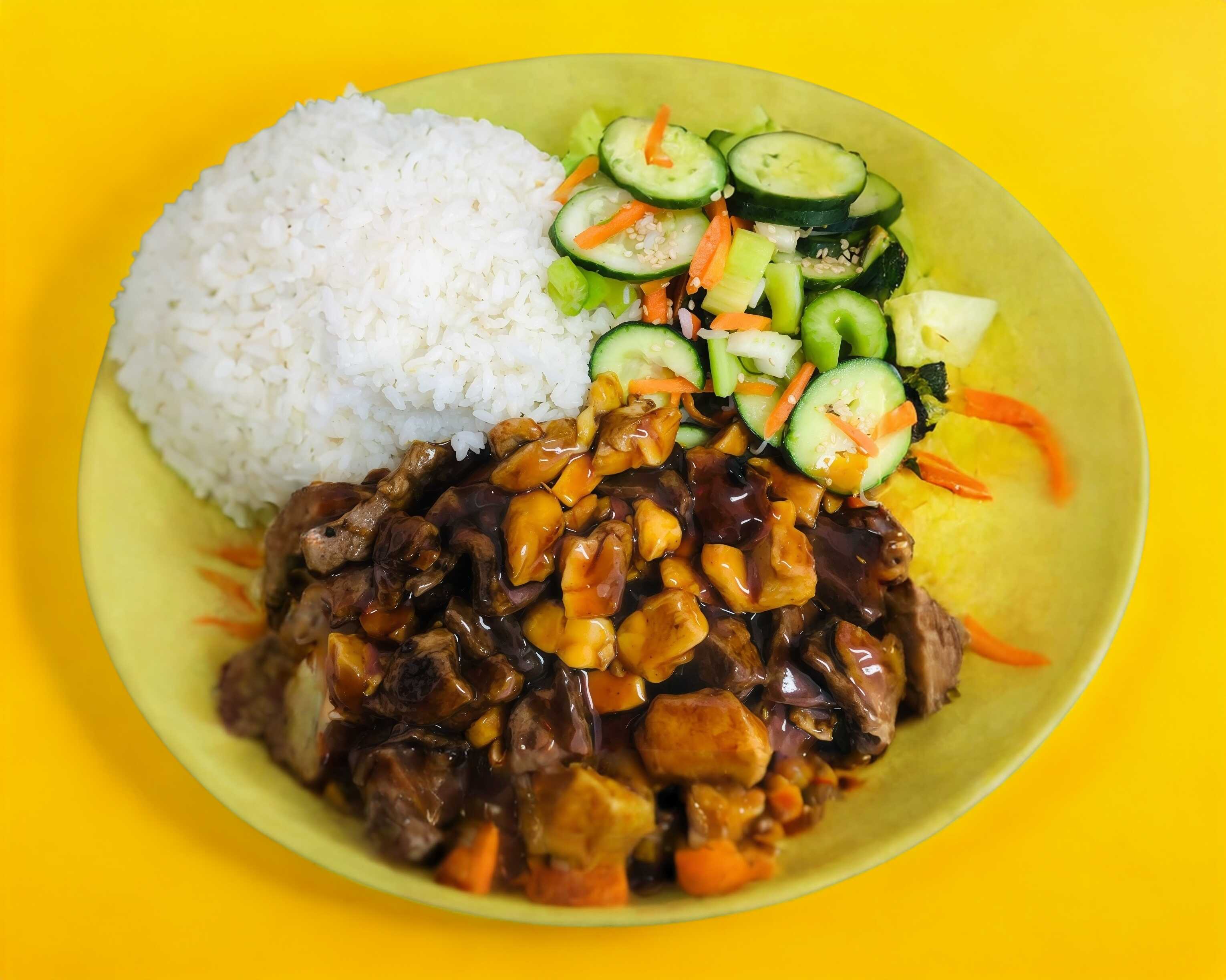 Proteína a la plancha, arroz blanco y ensalada oriental de pepino.