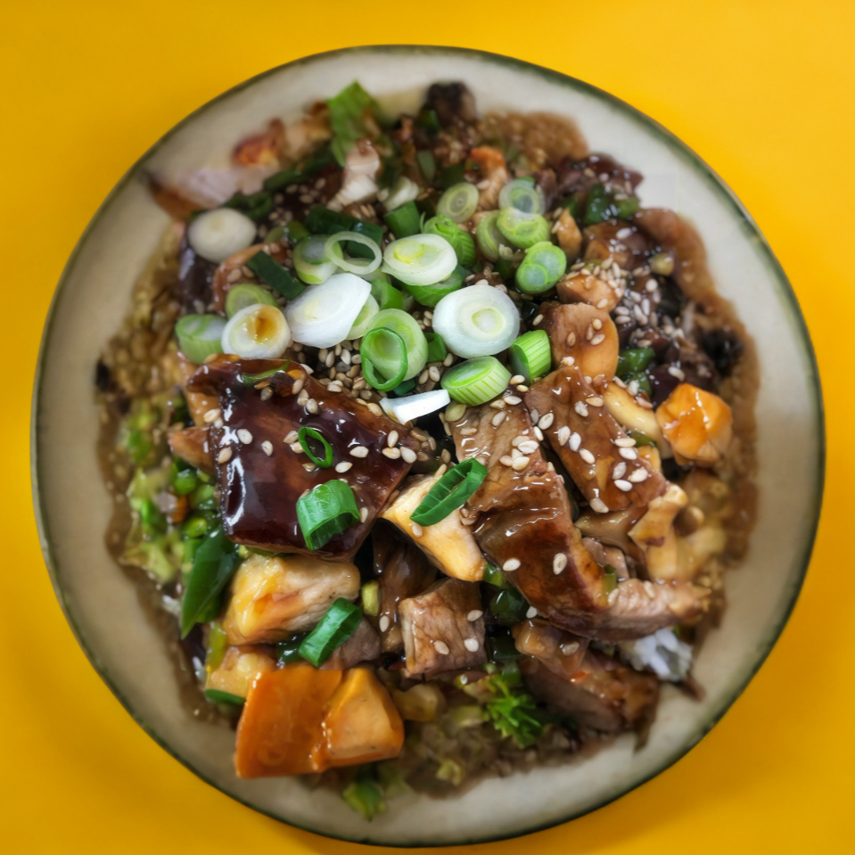 Proteína a la plancha con chile jalapeño, cebollín, ajonjolí y salsa tare, sobre una cama de arroz blanco.