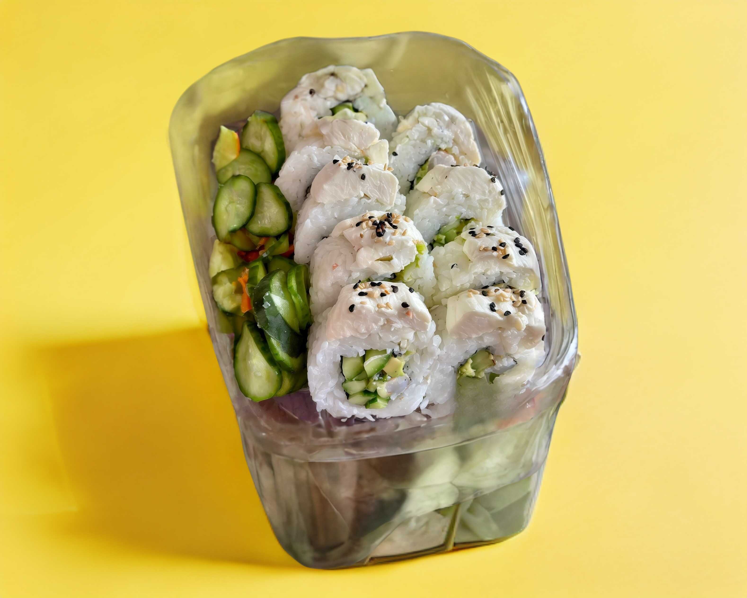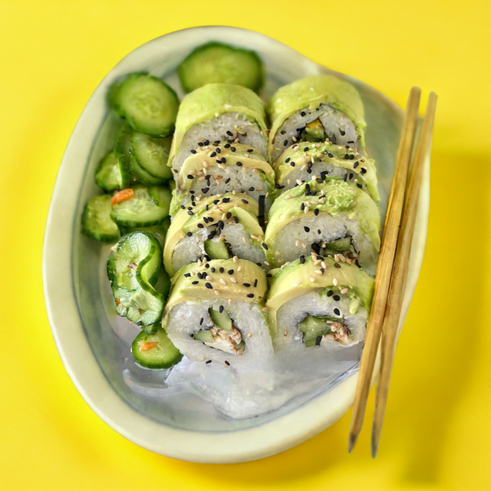 Queso crema, pepino y tampico. Forrado de aguacate.