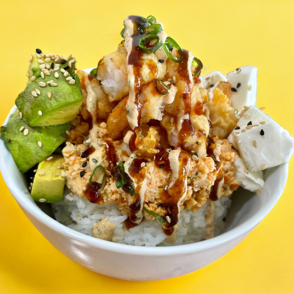 Arroz blanco, queso crema, aguacate,Tampico y camarón tempura