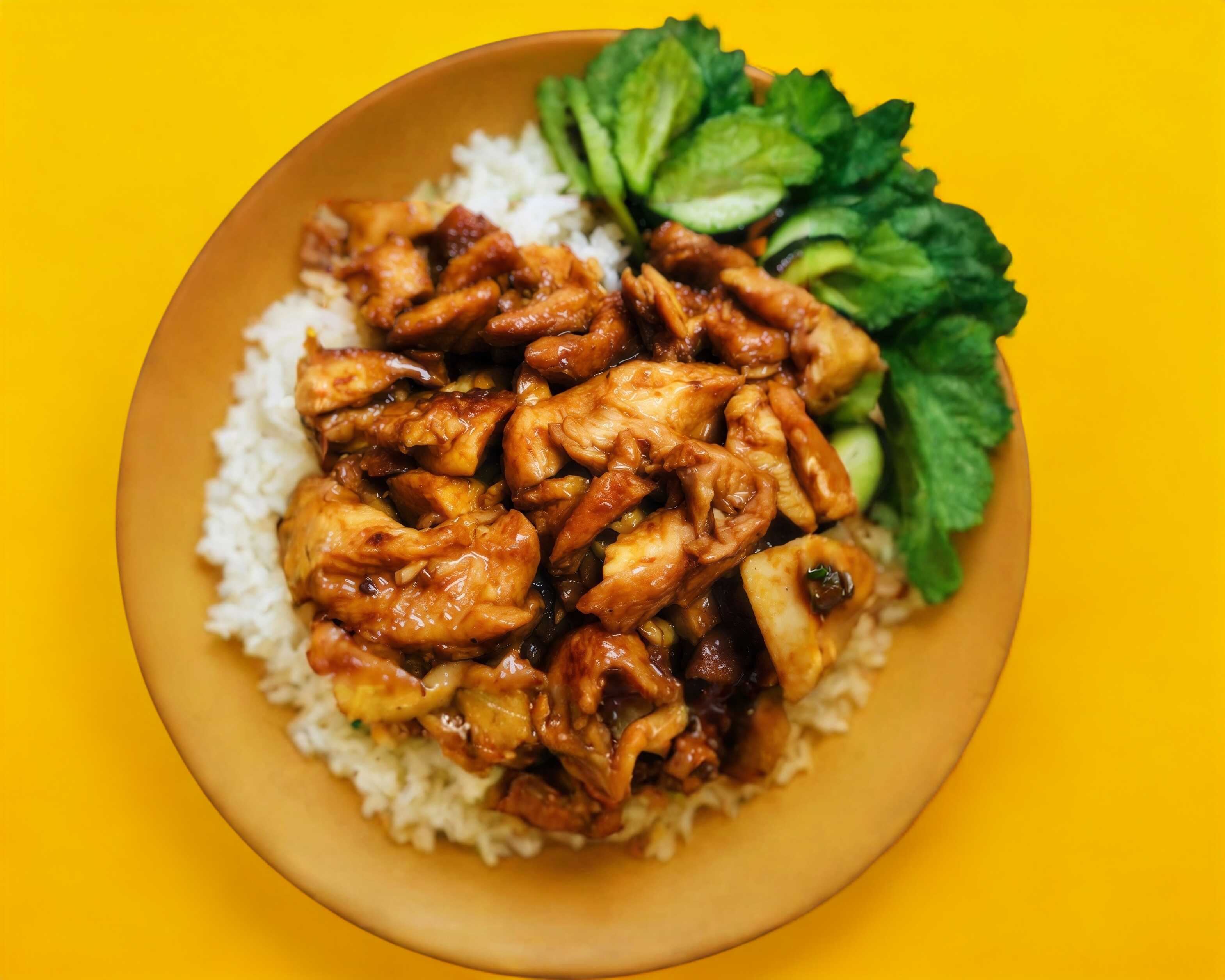 Porción individual de Proteína a la plancha con salsa tare, montado sobre arroz blanco.