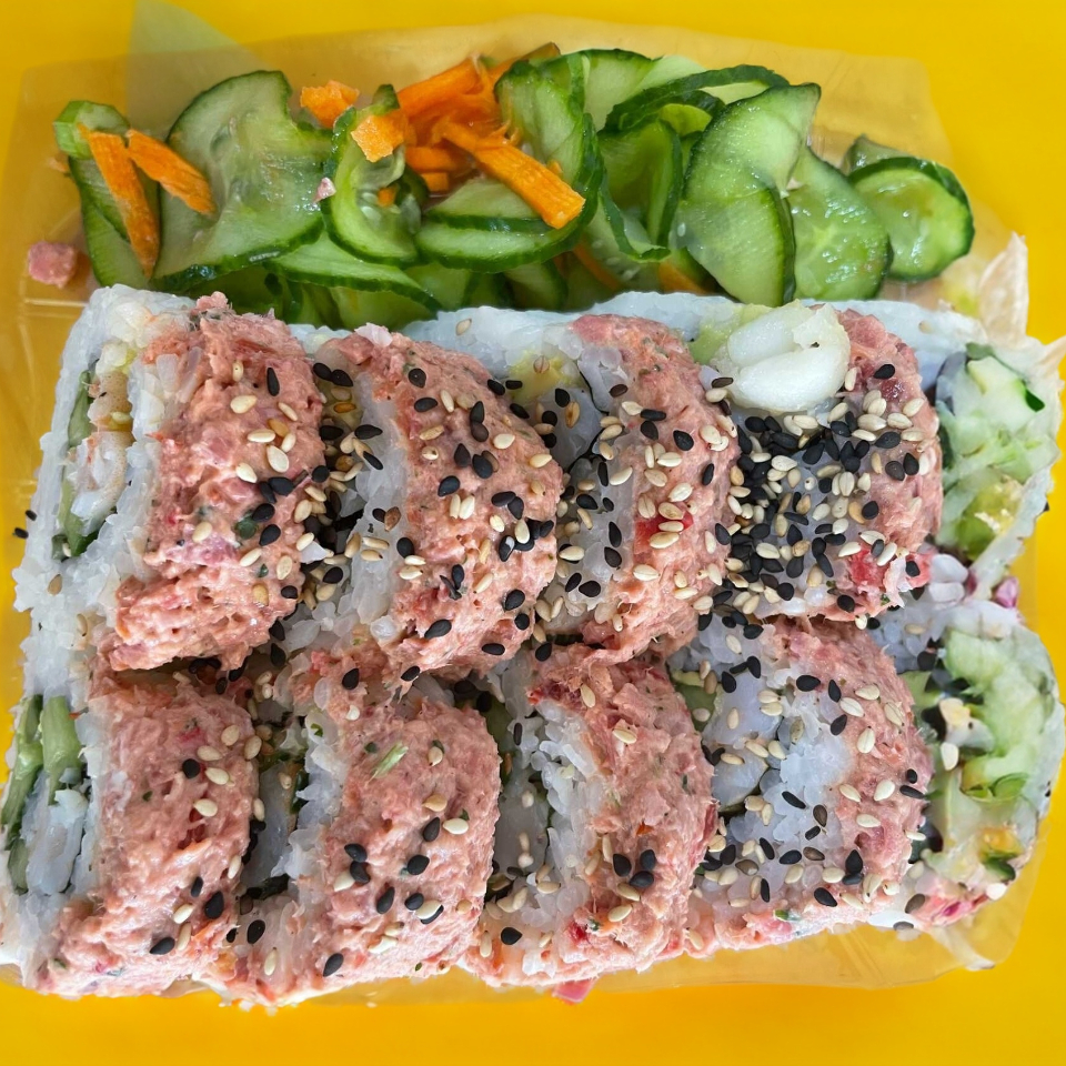 Arroz blanco, queso crema, aguacate, camarón tempura y marlin ahumado.