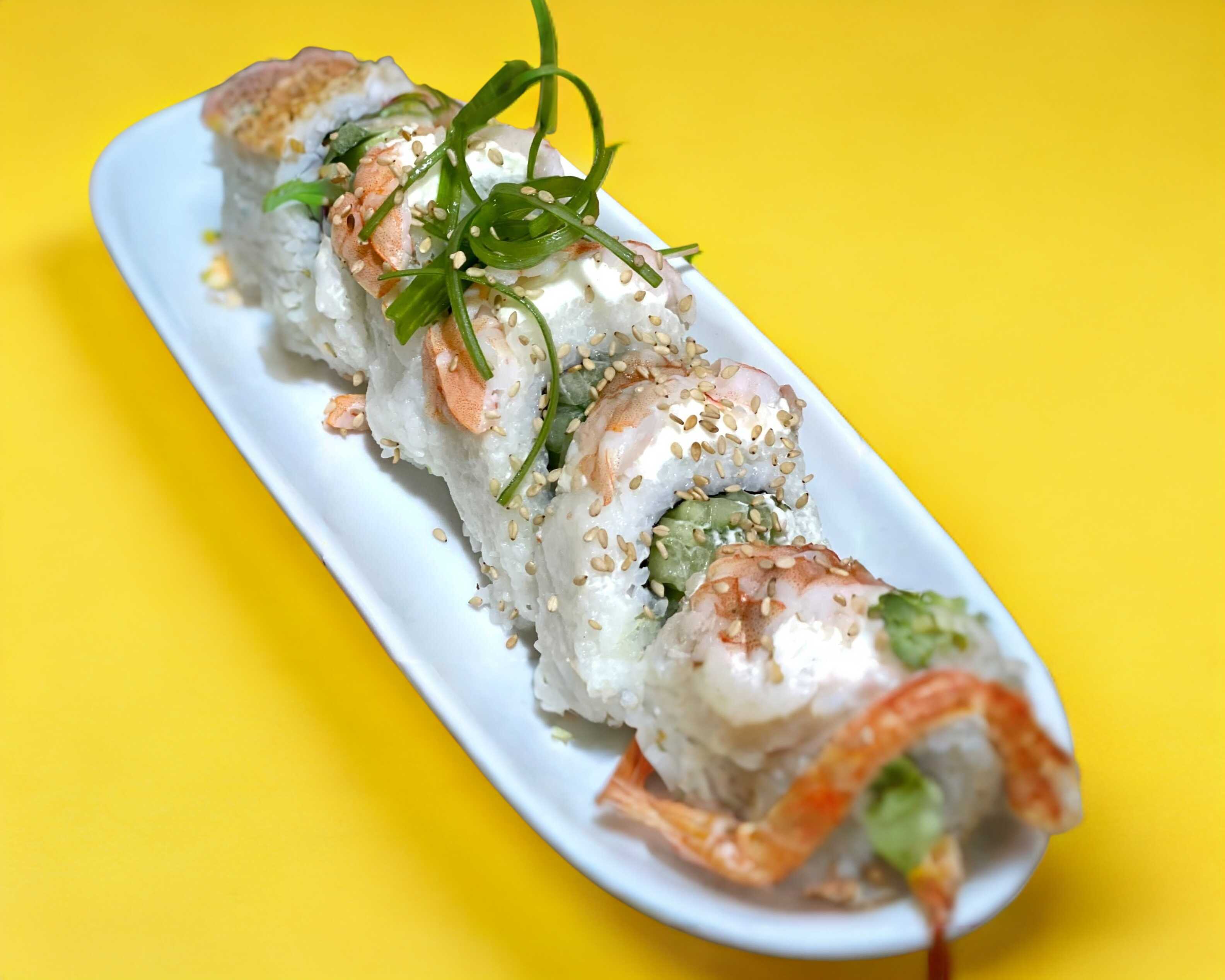 Queso crema, aguacate y camaron. Forrado de chile guerito y tampico encima.