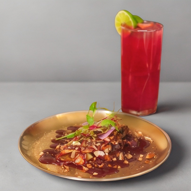 Mix de lechugas, camarón, arándanos, nuez garapiñada, manzana verde, betabel aderezo de frutos rojos