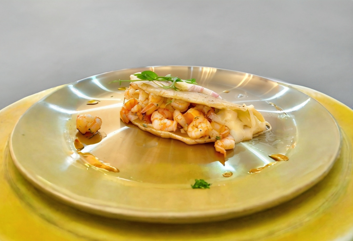 Camarones cocinados en mantequilla de café y nueces garapiñadas acompañado de ensalada de lechugas mixtas con vinagreta de frutos del bosque.