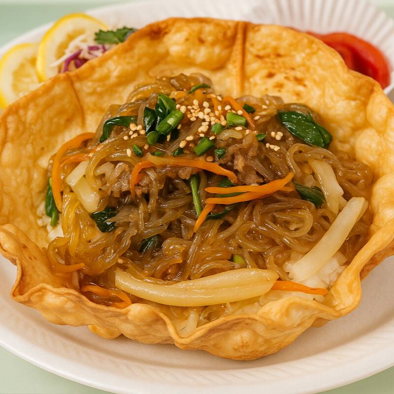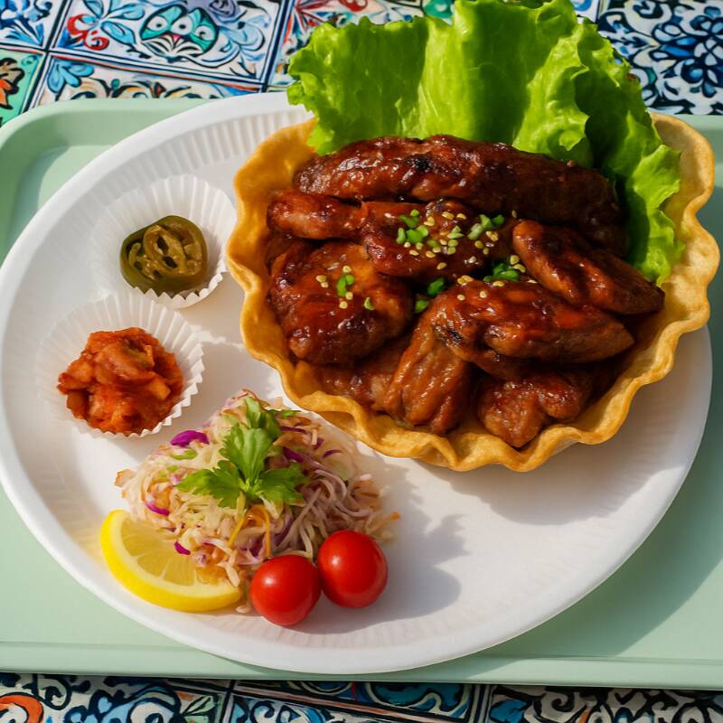 Tazón crujiente de tortilla relleno con pollo teriyaki al estilo coreano, servido con ensalada fresca y aderezo de la casa.