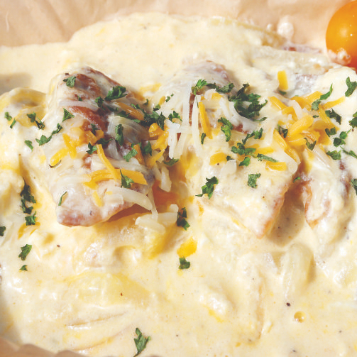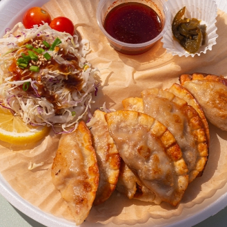 Dumplings dorados y crujientes cubiertos con una suave salsa cremosa. Cada bocado es una mezcla perfecta de sabor y textura.