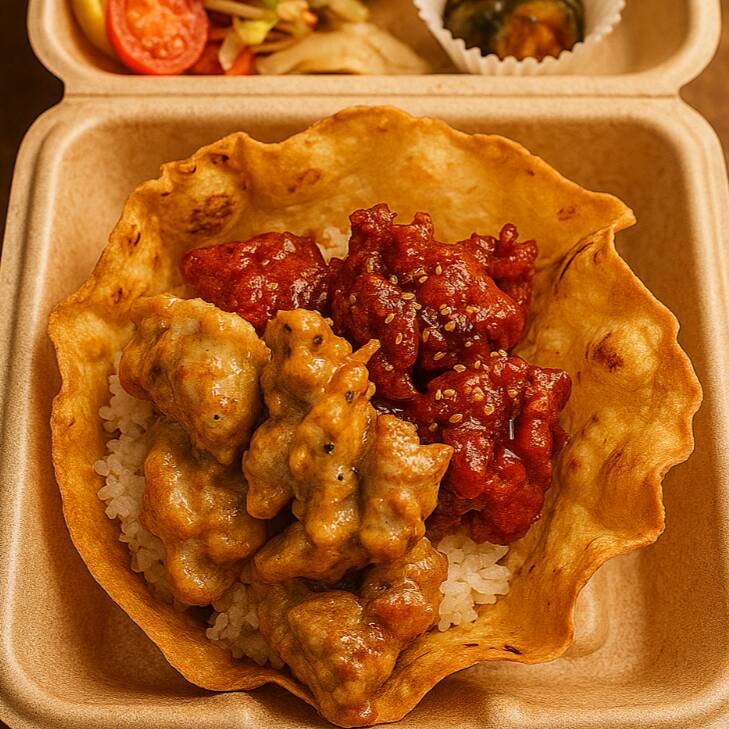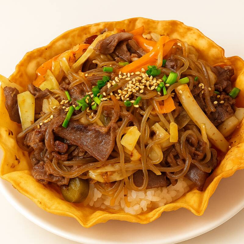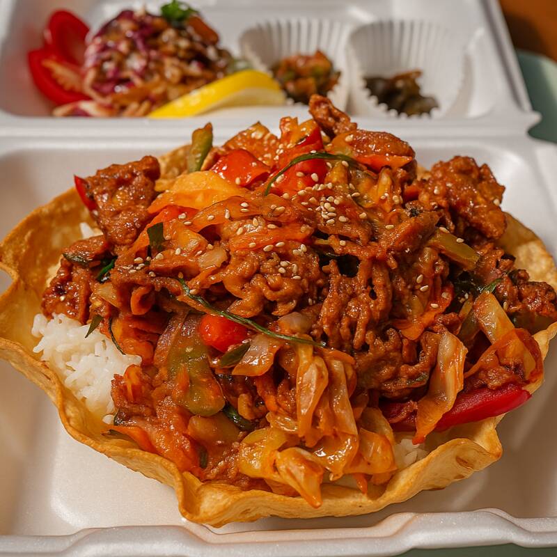 Tazón crujiente de tortilla relleno de bulgogi de res tierna, vegetales frescos y nuestra deliciosa salsa casera de bulgogi.