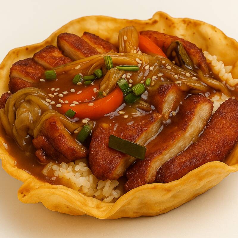 Tazón crujiente lleno de cerdo marinado en salsa picante y dulce, con cebolla, ajo, zanahoria, col y cebollín. Un equilibrio perfecto entre sabor y textura.