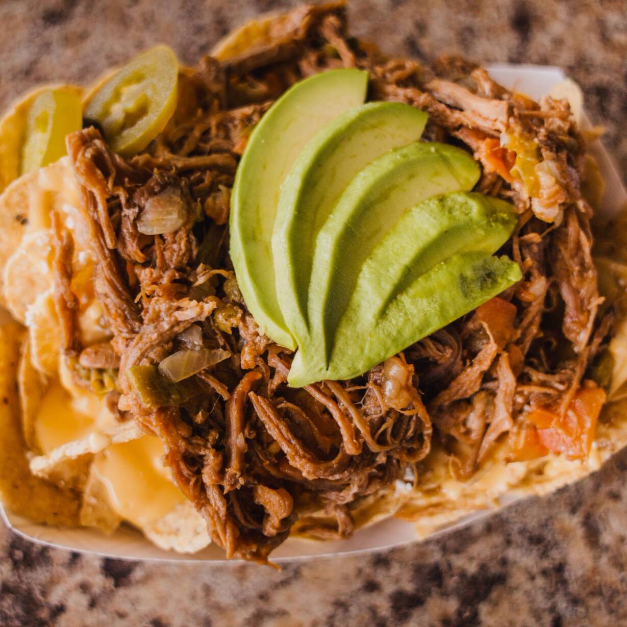 Nachos con Carne deshebrada chilies, queso blanco y aguacate