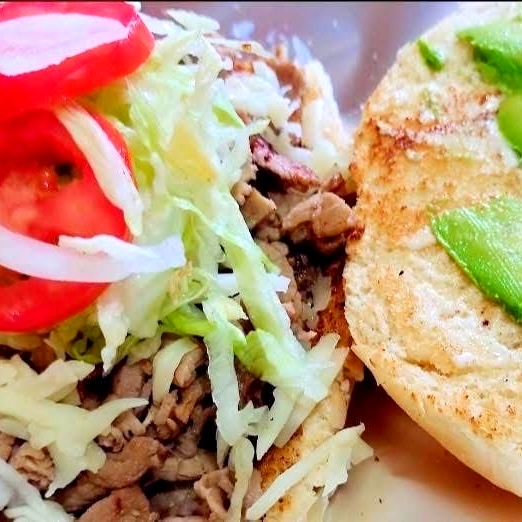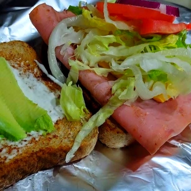 Pan caliento, mayonesa,jamon queso amarillo, lechuga,tomate, cebolla y aguacate