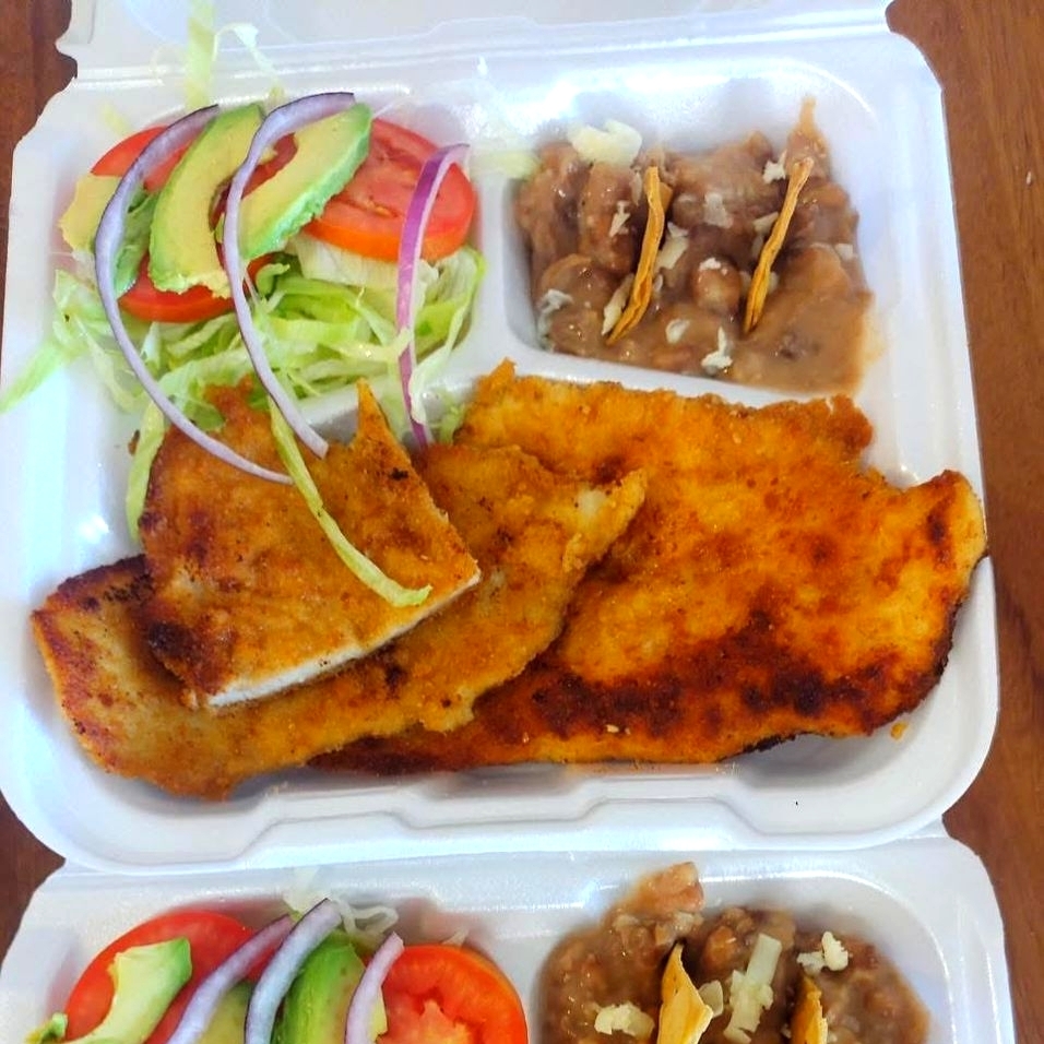 Milanesa de res,acompañada con frijoles y ensalada(lechuga,tomate, cebolla y aguacate)