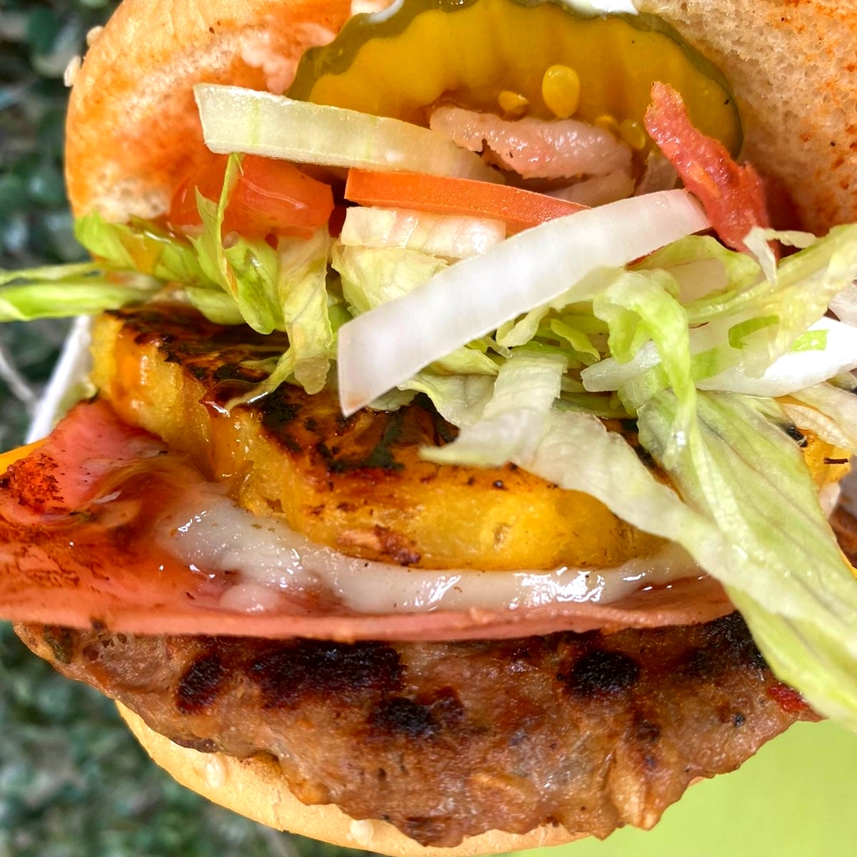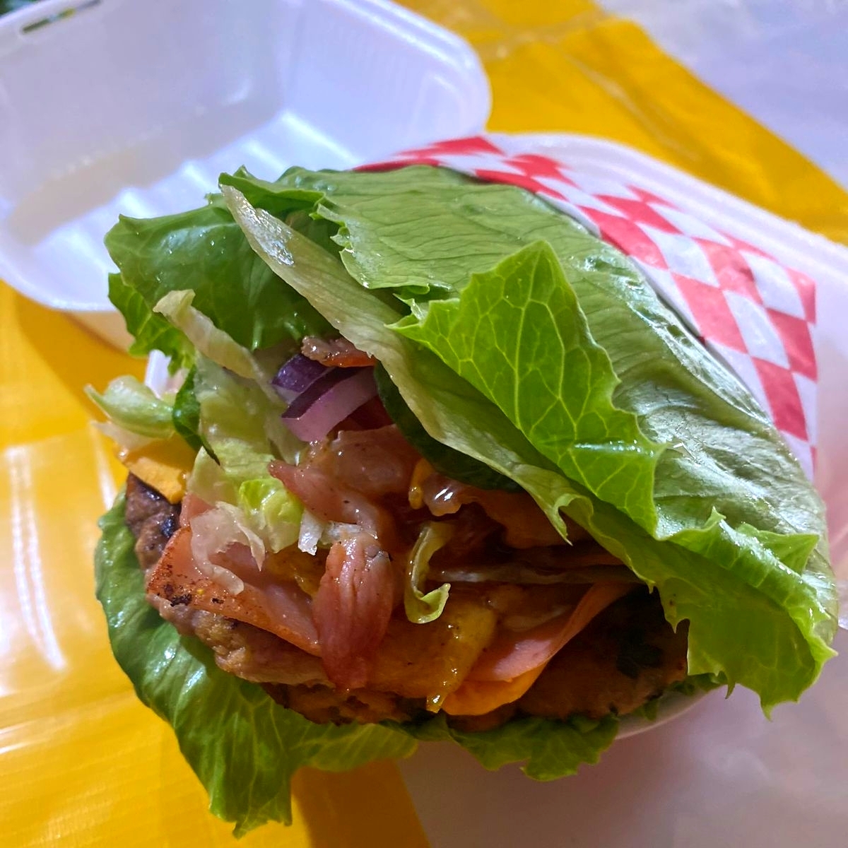 Envuelta en lechuga, carne casera, tocino, queso amarillo, queso blanco, BBQ, catsup, mostaza, pepinillo, lechuga y tomate