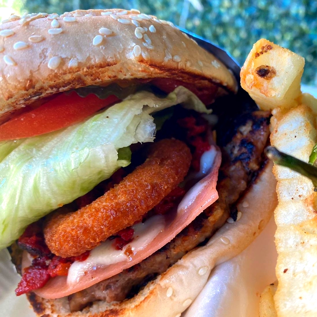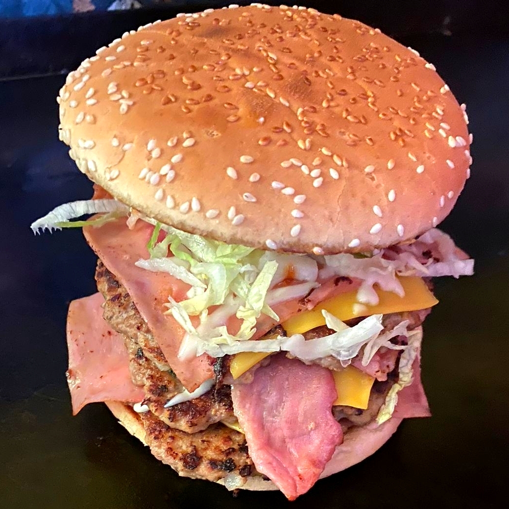 Doble carne casera, doble queso amarillo, doble tocino y aros de cebolla